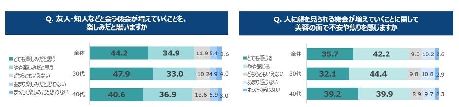 友人・知人などと会う機会が増えていくことを楽しみだと思っている女性は全体で79.1%※1もいるが、人に顔を見られる機会が増えていくことに関して美容の面で不安や焦りを感じている女性も全体で77.9%※2いることが分かりました。