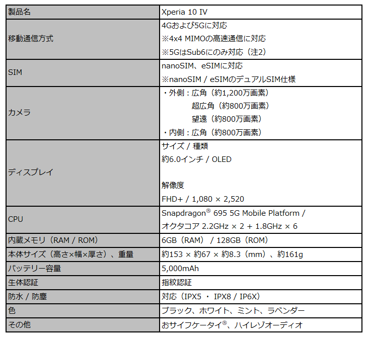 (注1)2022年5月11日現在、5,000mAh以上のバッテリーを搭載する5G対応スマートフォンとして世界最軽量。ソニー株式会社調べ。