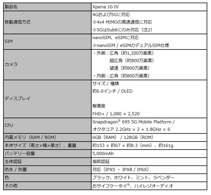 「Xperia 10 IV」は、急速充電(注3)に対応した5,000mAhの大容量バッテリーを搭載する約161gの世界最軽量ボディーと、幅約67㎜の手になじみやすく快適に持ち歩くことができるサイズが特徴の5G対応スマートフォンです。カメラには「Xperia 10シリーズ」初の光学式手ブレ補正機能(注4)やオートHDR、進化したナイトモード機能を搭載し、明暗差の激しいシーンや夜景など、様々なシーンで高精細な撮影が可能です。さらに、画面には従来機種の「Xperia 10 III Lite」(注5)から通常環境下における輝度を約1.5倍(注6)向上させた有機ELディスプレイを採用しており、有機ELディスプレイの強みである高コントラストの映像美によって、さらに没入感を高めた視聴体験を実現しています。