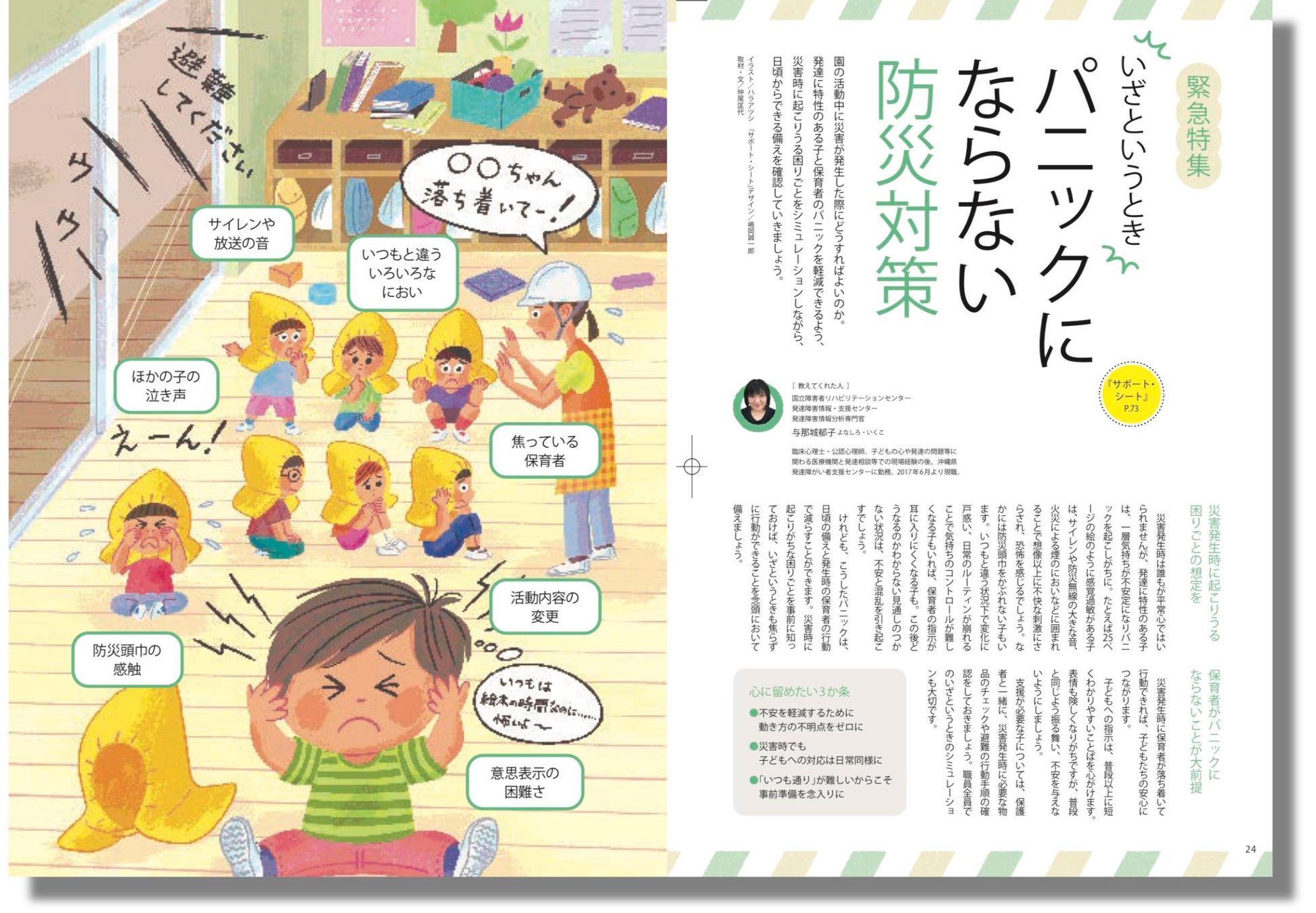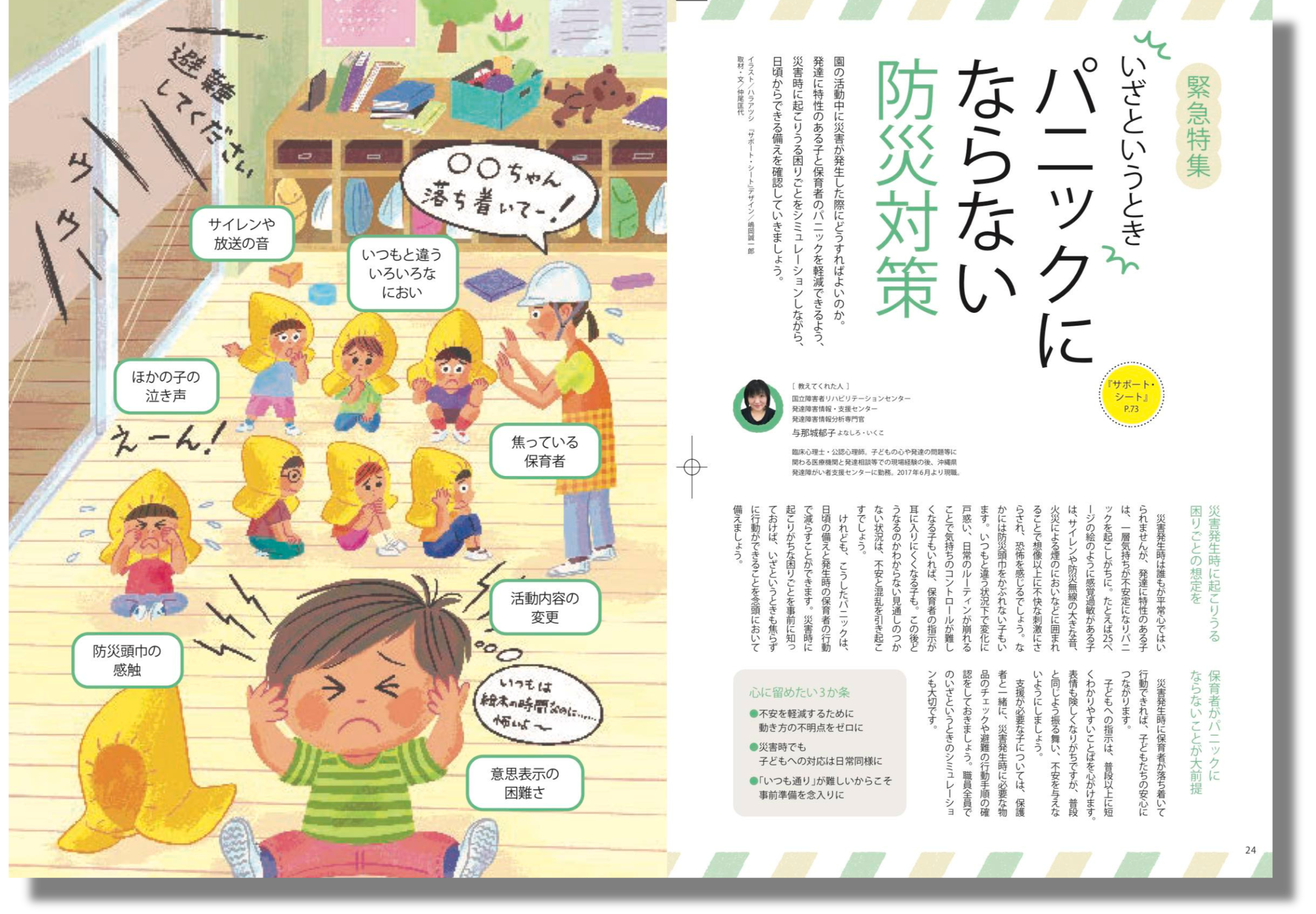 園で災害が起こったときに、特性がある子も落ち着いて行動できるように、今、準備できることや対応法を知っておきましょう。「もしものときのサポートシート」付き。