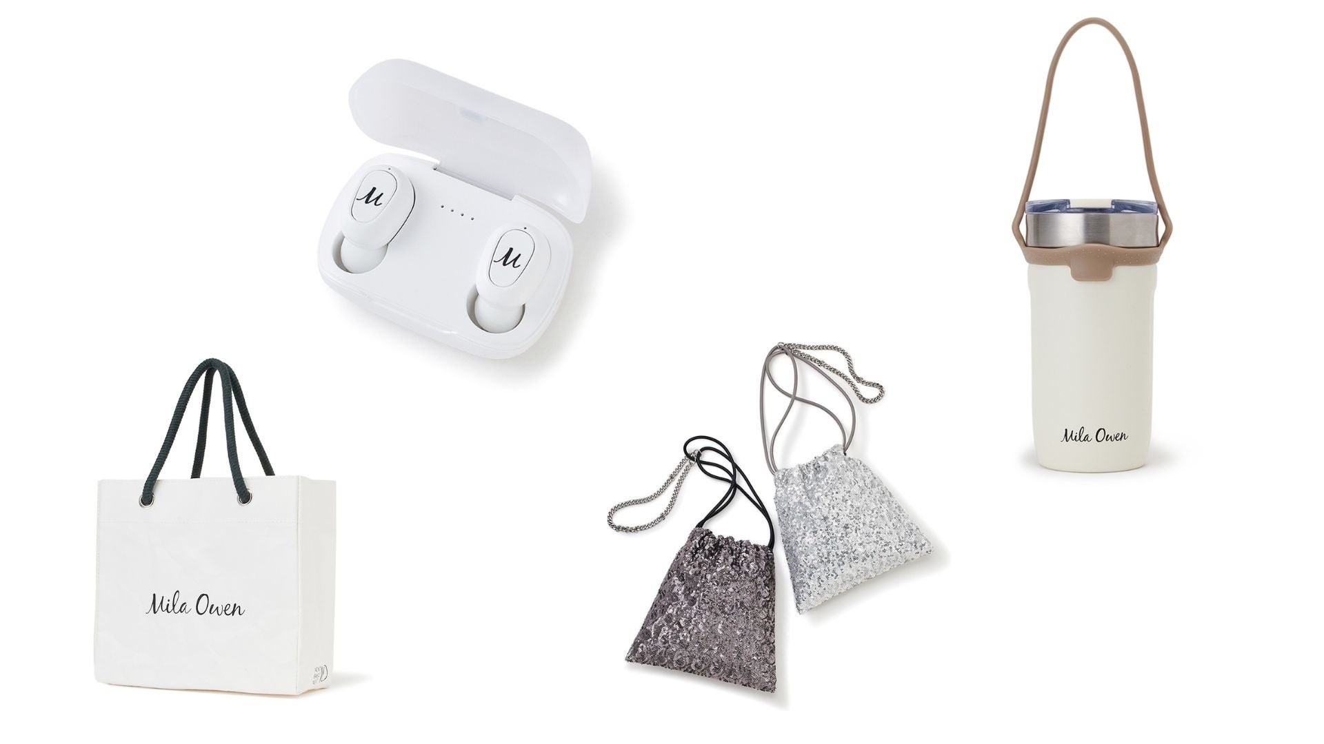 ミラ オーウェンの店頭・ECサイトではお買い物金額に応じて、10周年限定ノベルティもプレゼント(先着順)。5500円以上のお買い上げでミニペーパーバッグ、16,500円以上のお買い上げでタンブラーをプレゼント。リニューアルオープンするルミネ新宿2店・ルミネ池袋店・ルクア大阪店では、27,500円以上のお買い上げでスパンコールミニバッグ、33,000円以上のおかげでワイヤレスイヤホンをプレゼント。アニバーサリーイヤーということで、店頭のノベルティもさらに豪華なラインナップとなっています。