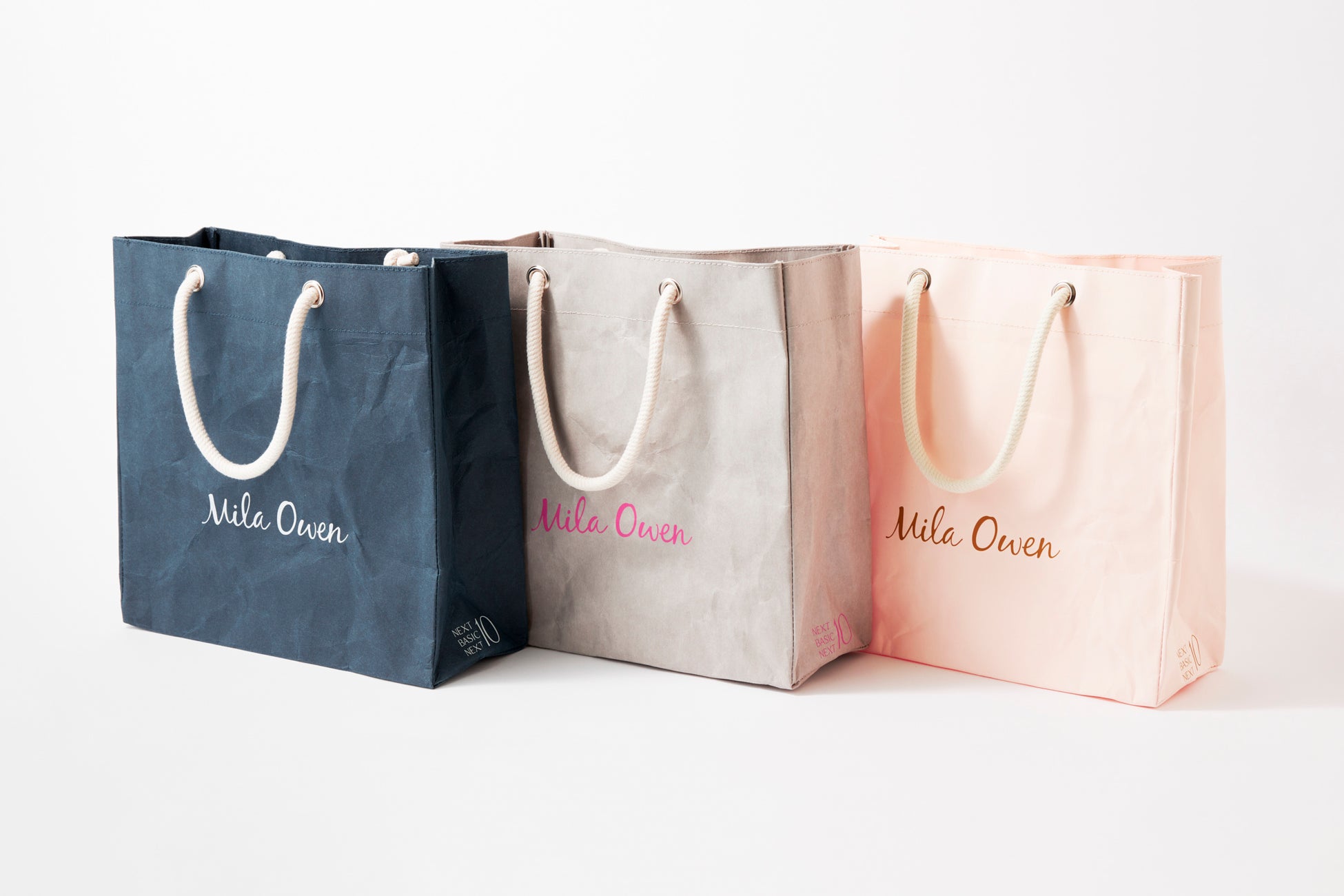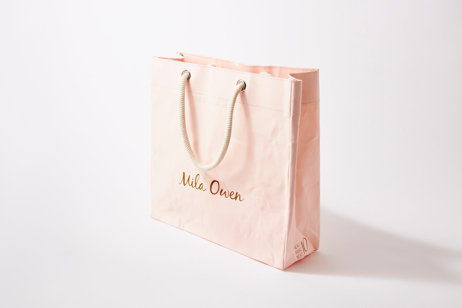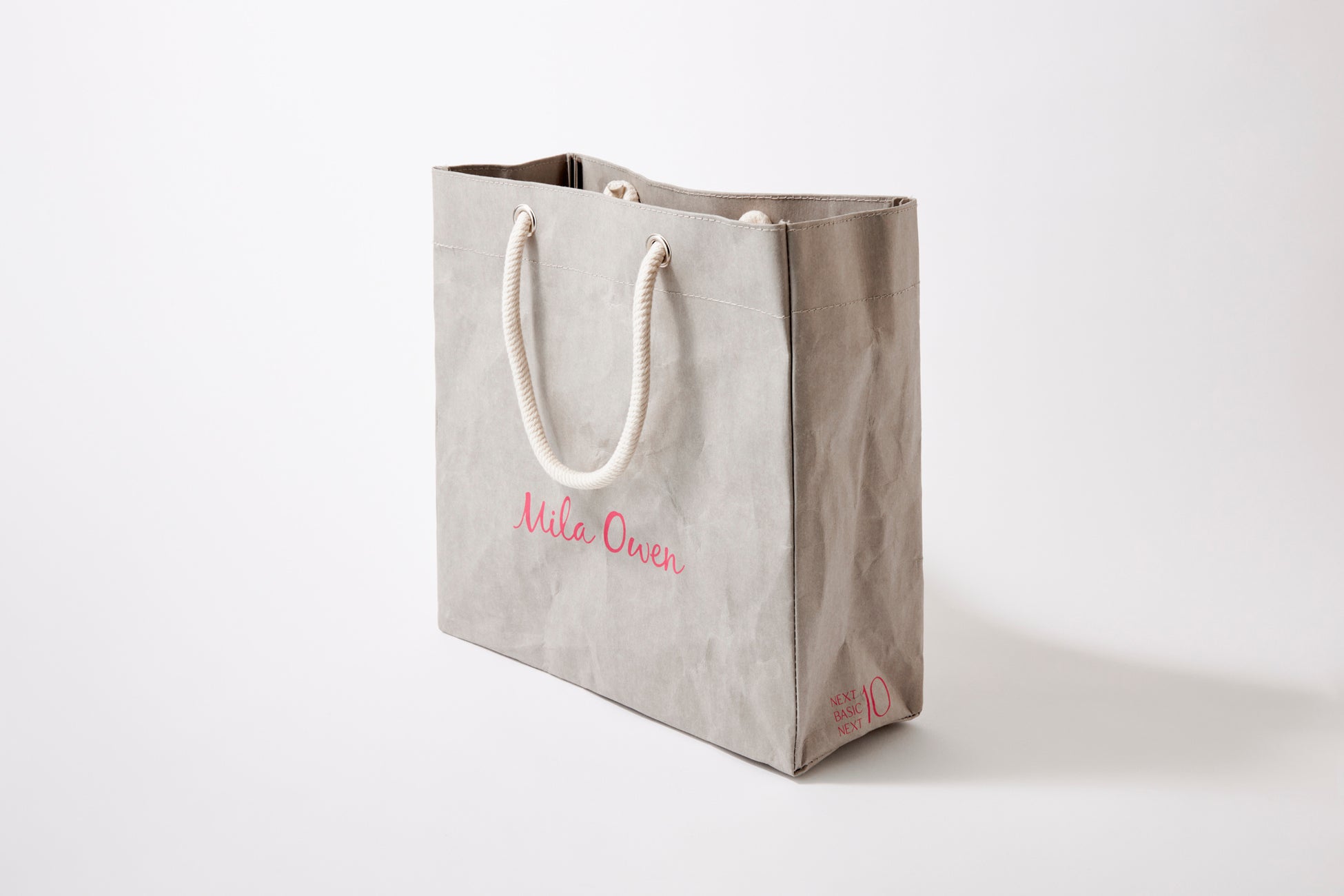 正面にミラ オーウェンのロゴ、側面には10周年記念ロゴをあしらったオリジナルカラーのノベルティ。ショッパーは植物由来成分の素材から作られており、リサイクルと生分解が可能。地球環境へのやさしさにもこだわりました。水にぬれても乾かして繰り返し使うことのできる撥水性のある素材です。A4サイズもしっかり入る大き目の作りなので通勤時のサブバッグやお買い物用のバッグとしてもご使用頂けます。2月28日(水)よりルミネ新宿2店・ルミネ池袋店・ルクア大阪店の3店舗と、名古屋高島屋店・阪急うめだ店にて順次配布を開始いたします(数量限定。配布時期は3誌ごとに異なります)。