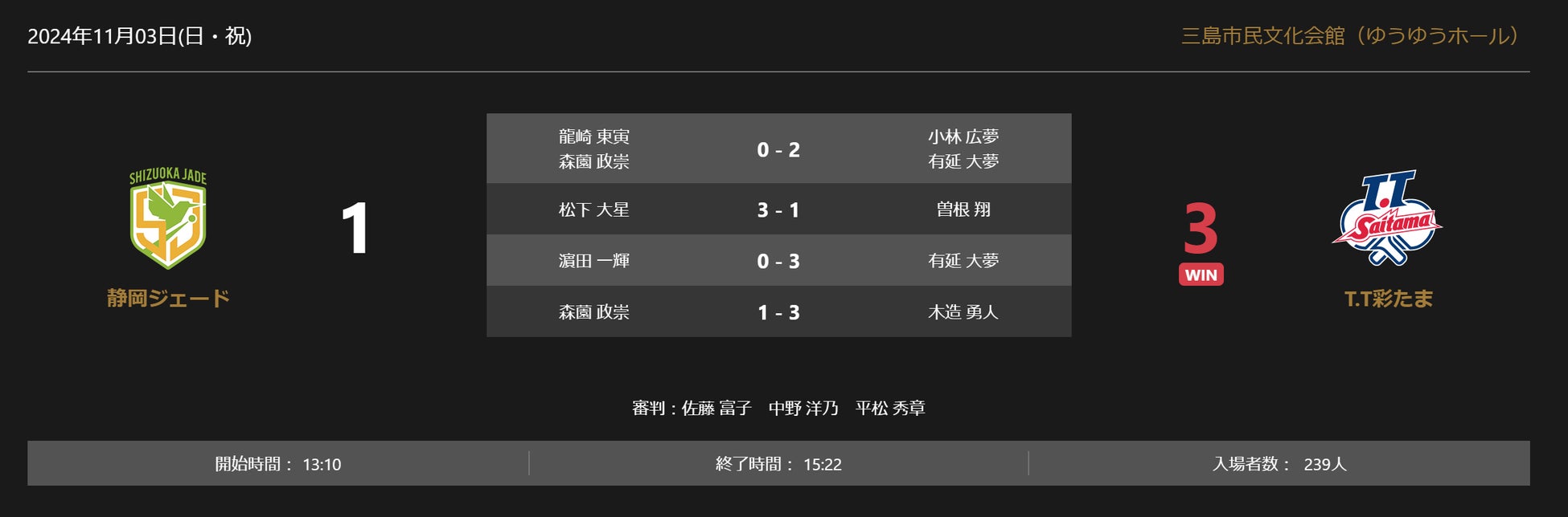 ノジマTリーグ 2024-2025シーズン 公式戦 11月3日開催 静岡ジェード vs T.T彩たま 試合結果