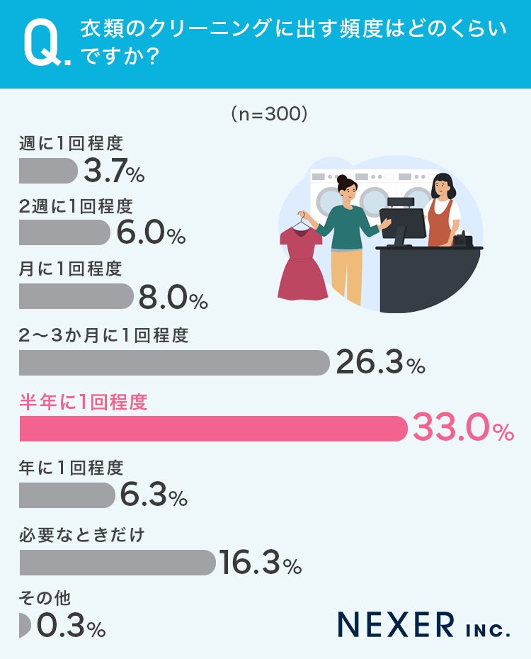 ■衣類のクリーニングに出す頻度、33%が「半年に1回程度」と回答