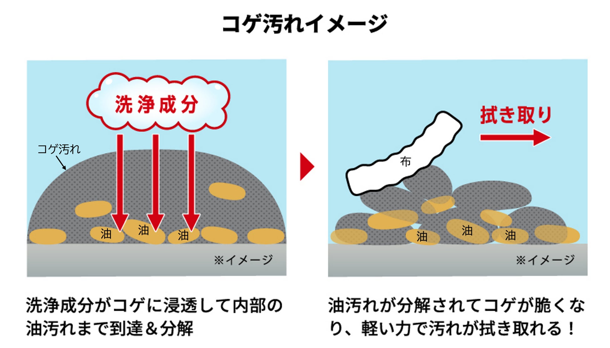 今回、改めてコゲ汚れを詳しく調べてみると、「固着したコゲの内部には強固な油汚れが存在する」ことを発見。そこで本商品は、花王独自の「変性油洗浄技術」を採用しました。スプレーすると、濃密泡の洗浄成分がジュワジュワとコゲに浸透して内部の油汚れを分解。コゲが固着する原因となっていた油汚れが分解されることで、頑固な汚れも軽い力で落とすことができます。