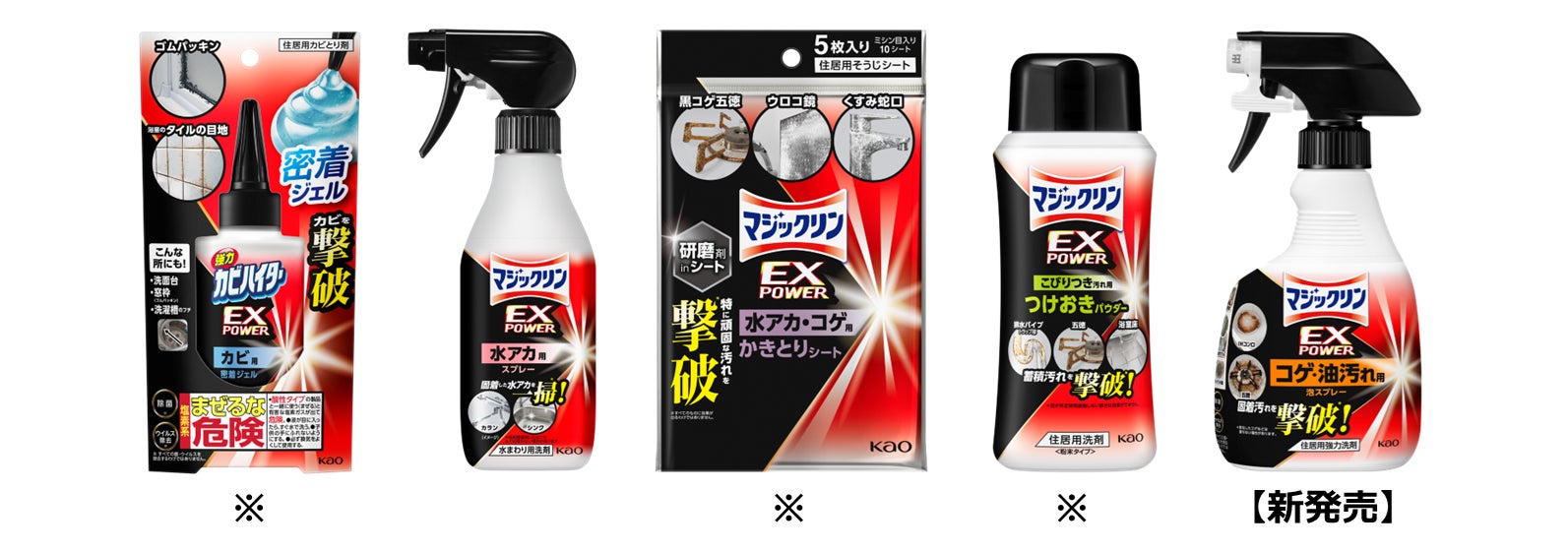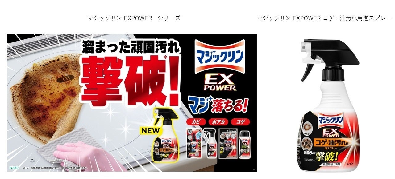 2024年11月に誕生した「マジックリン/カビハイター EXPOWER」は、「浴室用」「キッチン用」などと「そうじする場所」を限定するのではなく、「水アカ用」「カビ用」「コゲ用」「こびりつき汚れ用」といった「汚れの種類」に特化した4つの商品からなる強力洗剤シリーズです。こまめにそうじができずに、蓄積してしまった家じゅうの頑固な汚れまで落とす高い商品性能が支持され、多くのお客さまからご好評をいただいております。