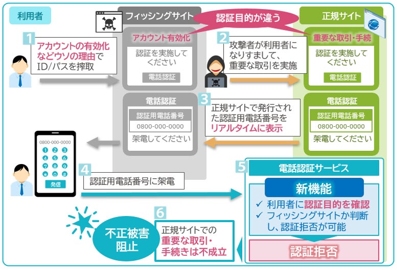 「電話認証サービス」では、リアルタイムフィッシングのこの特徴に着目し、利用者からの電話認証の架電の際に、認証目的を確認する機能を追加することにより、利用者にフィッシングサイトであることを気づかせ、認証拒否することでリアルタイムフィッシングを防止することを可能にしました。本機能により、多要素認証を導入している企業サイトのフィッシングおよびリアルタイムフィッシング対策を強化し、セキュリティをより一層向上させることに寄与します。