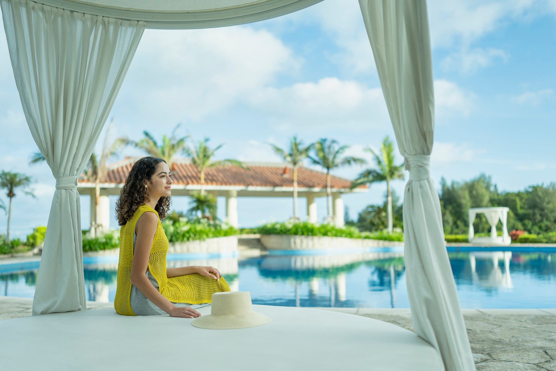 カバナとはプライベートな休憩スペースを指しており、沖縄県最大級を誇るガーデンプールの各所に設置された優雅なカバナは、喧騒を忘れさせる特別な空間。緑豊かな自然に囲まれ、爽やかな南国の風が吹き抜ける優雅なカバナで、親しい友人や大切なパートナーとだけのプライベートな優雅な時間をお過ごしいただけます。