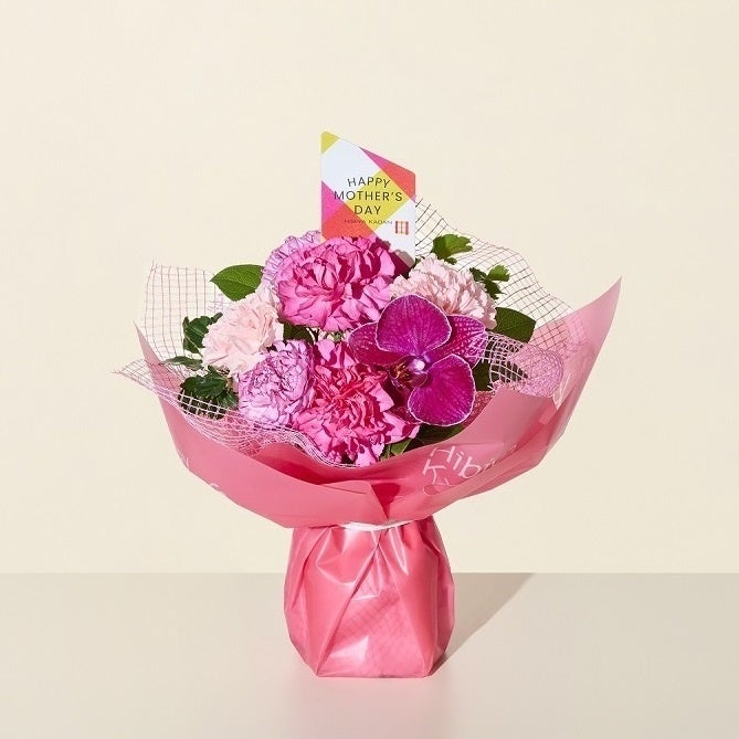 カーネーションとコチョウランを華やかにまとめたピンクが印象的なブーケ。