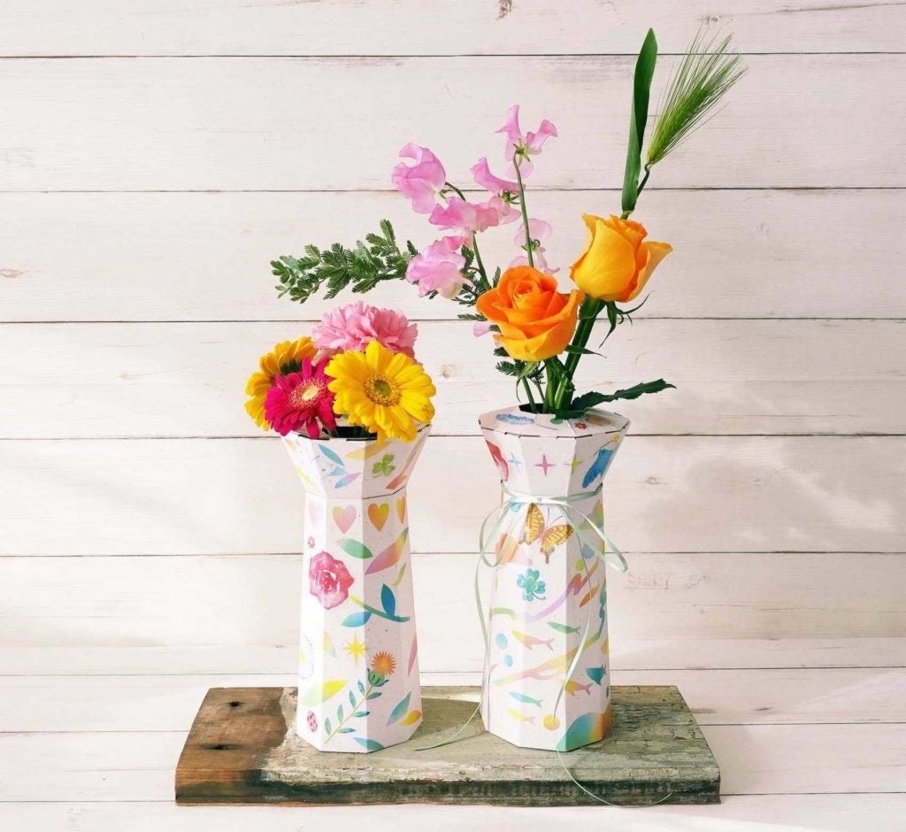 紅花製品の製造過程で生じる花弁の廃棄物を原料に配合したエコ段ボールを組み立ててフラワーベースを作ろう!使用済みのペットボトルを組み合わせれば花瓶として使用できます。