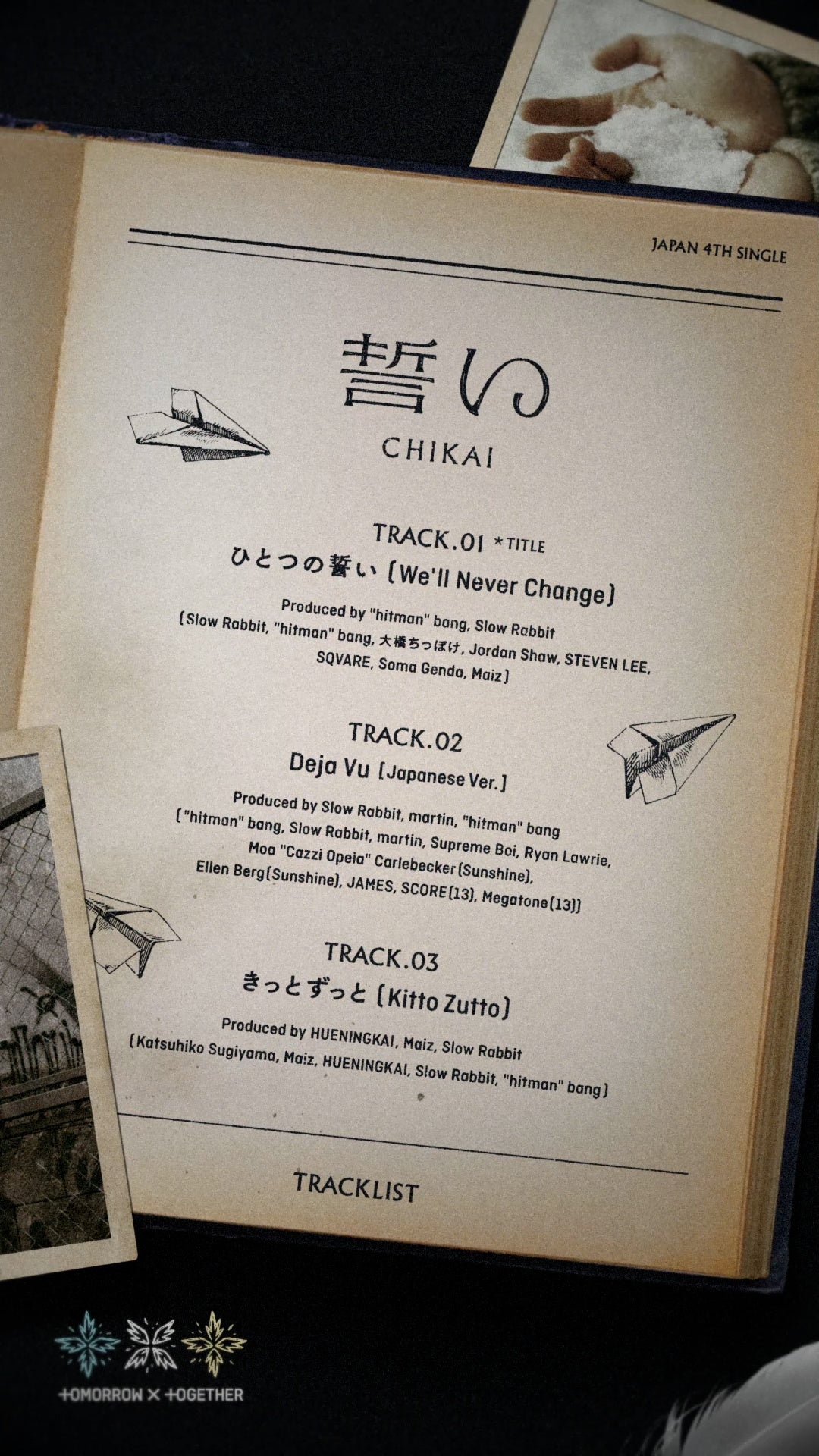 今年デビュー5周年を迎えるTOMORROW X TOGETHERの4作目のシングル「誓い(CHIKAI)」にはタイトル曲「ひとつの誓い (We’ll Never Change)」とメンバーのHUENINGKAIが楽曲制作に参加したオリジナル曲「きっとずっと (Kitto Zutto)」、今年4月に発売された韓国6th Mini Album『minisode3: TOMORROW』のタイトル曲の日本語バージョンである「Deja Vu [Japanese Ver.]」の全3曲を収録。ジャケット写真は、初回限定盤A(映像盤)、初回限定盤B(フォトブック盤)、通常盤・初回プレス、Weverse Shop JAPAN限定盤(フォトブック盤)、UNIVERSAL MUSIC STORE限定盤、初回限定メンバーソロジャケット盤で全10種を用意しています。