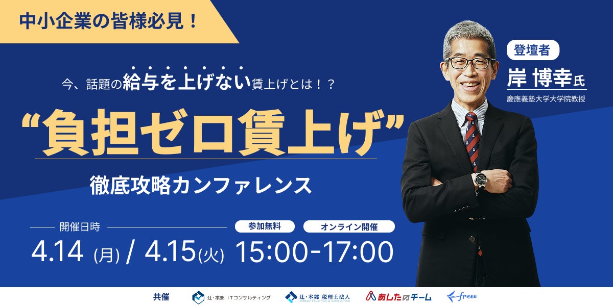 freeeでは辻󠄀・本郷 税理士法人、辻・本郷 ITコンサルティング株式会社、株式会社あしたのチームと共催で、4月14日(月)・15日(火)の2日間、「“負担ゼロ賃上げ”徹底攻略カンファレンス」をオンラインで開催します。