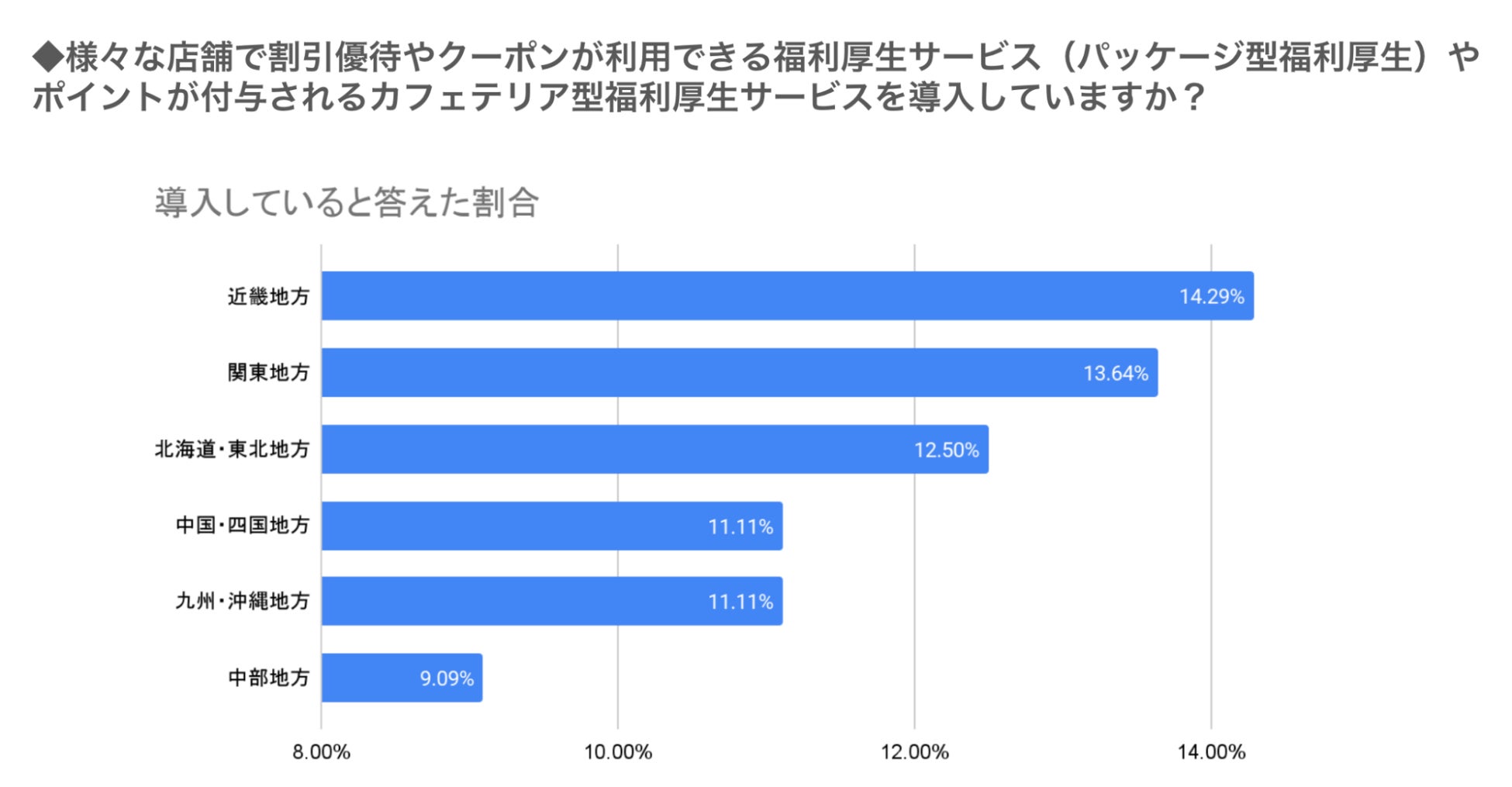 そのパッケージ型・カフェテリア型福利厚生を導入している企業の割合は、近畿地方が全国の中で最も高い14.29%となり、次いで関東地方の13.64%という結果となりました。