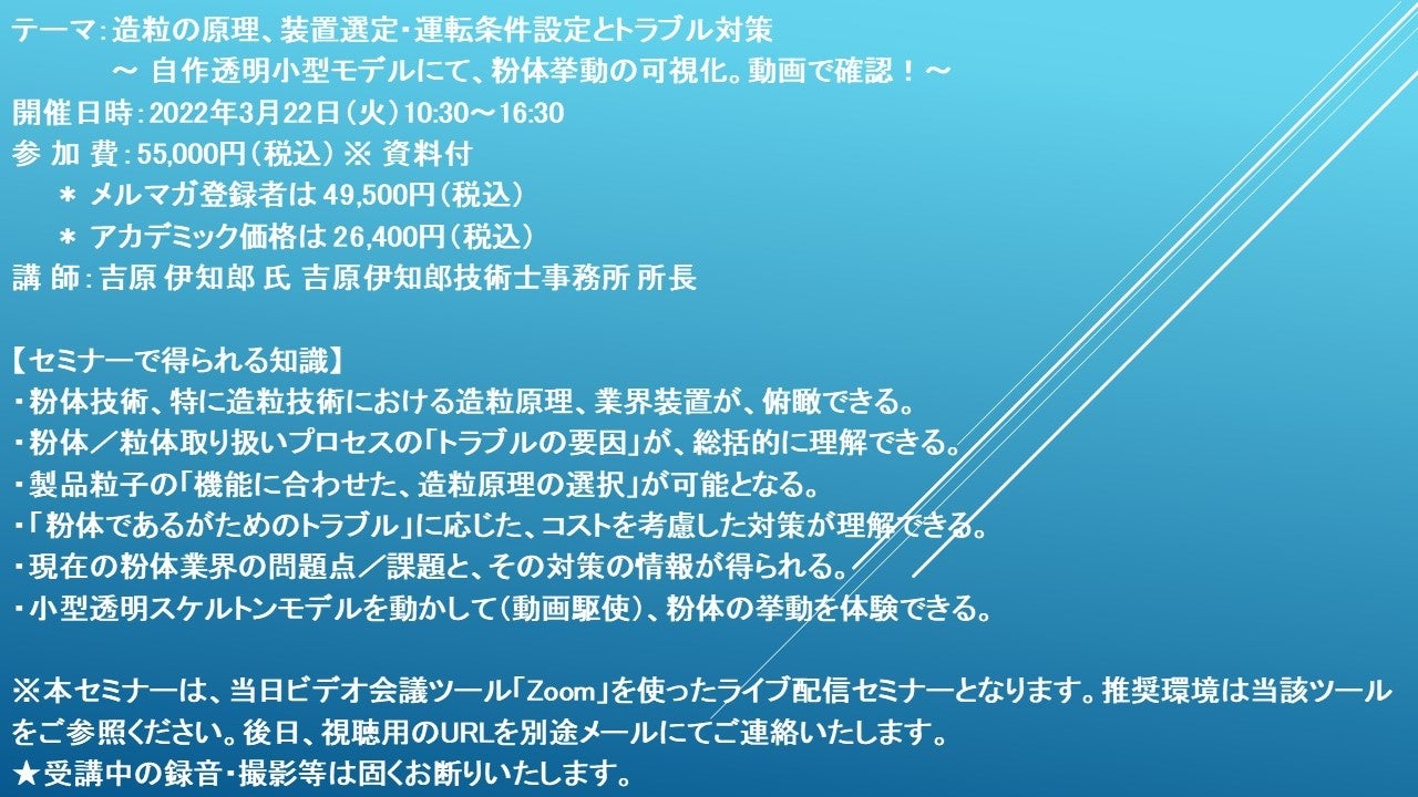 先端技術情報や市場情報を提供している(株)シーエムシー・リサーチ(千代田区神田錦町: https://cmcre.com/ )では、 各種材料・化学品などの市場動向・技術動向のセミナーや書籍発行を行っておりますが、 このたび「造粒の原理、装置選定・運転条件設定とトラブル対策~ 自作透明小型モデルにて、粉体挙動の可視化。動画で確認!~」と題するセミナーを、 講師に吉原 伊知郎 氏 吉原伊知郎技術士事務所 所長)をお迎えし、2022年3月22日(火)10:30より、 ZOOMを利用したライブ配信で開催いたします。 受講料は、 一般:55,000円(税込)、 弊社メルマガ会員:49,500円(税込)、 アカデミック価格は26,400円(税込)となっております(資料付)。