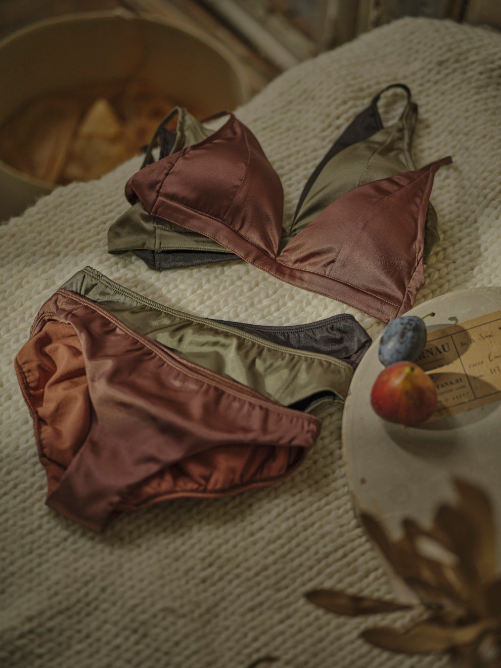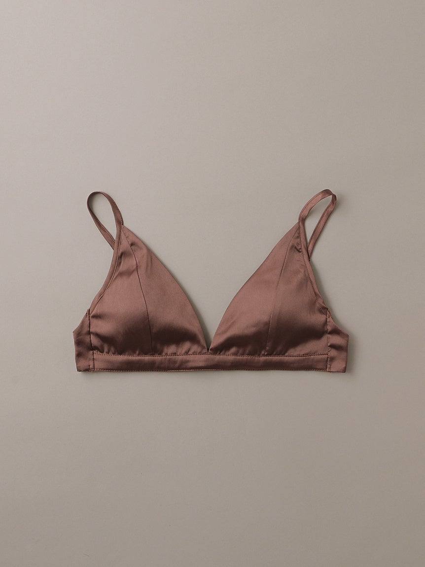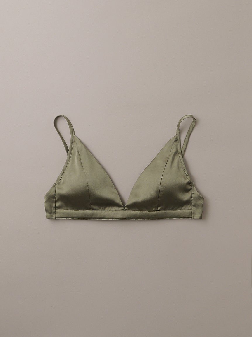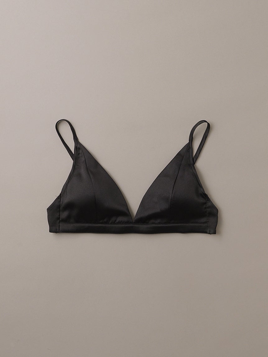 華奢な肩紐とバックストラップが女性らしさを演出してくれるトライアングルタイプのサテンブラトップ。