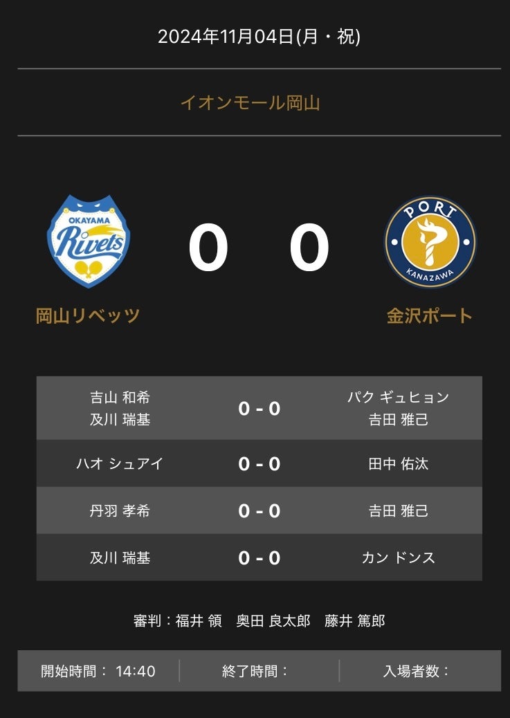 ノジマTリーグ 2024-2025シーズン 公式戦 11月4日開催 岡山リベッツ vs 金沢ポート東京 オーダー発表