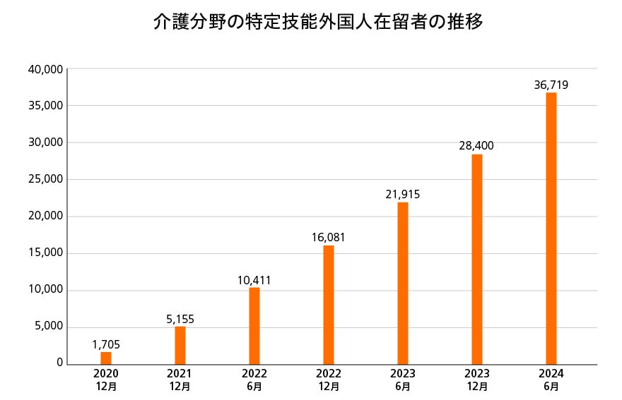 介護現場での人材不足解消に向け、外国人介護人材の活用が進んでいます。特にコロナ禍収束以降、2024年6月現在で特定技能ビザで介護の仕事に就いている外国人は36,719人と、2022年6月から約3.5倍に増えています(※1・下図参照)。