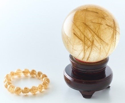 2023年癸卯(みずのと うさぎ)の年は「水」と「金」が重要なポイント。水のエネルギーを持つ水晶に、金色に輝くルチルが入り込んだ「金針ルチルクォーツ」は2023年を代表するパワーストーン。/11階〈風水開運中心〉