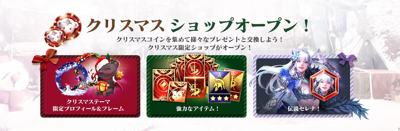 各種イベントで集めたクリスマスコインを利用して、「希望の歌 セレナ」の霊魂石や「究極の伝説+装備セットオプション」などの豪華アイテムと交換できるイベントショップを期間限定でオープンいたします。