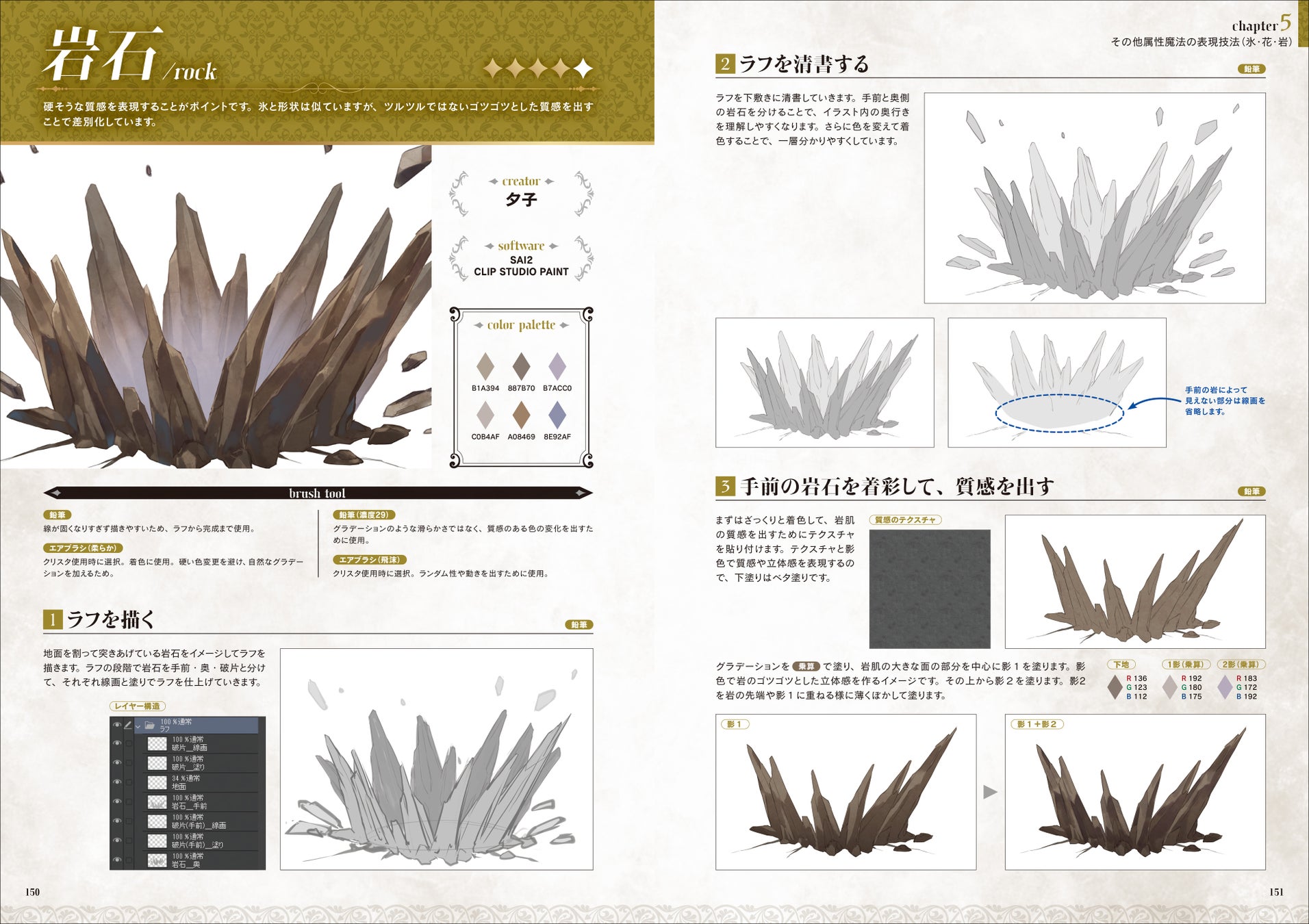 近年の魔法表現の中でも見る機会が多い火、水、雷、風、氷、草、岩について魅力あふれる作家6名の描き下ろしイラストで解説!