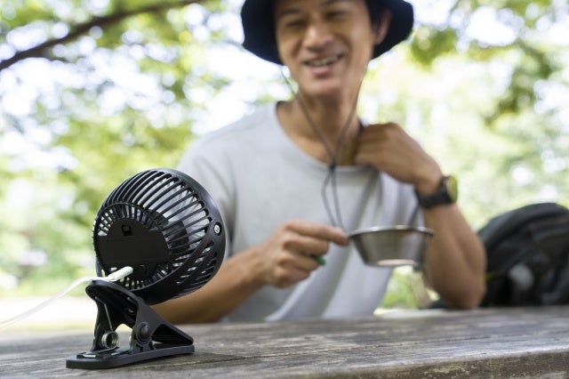 この扇風機は、台座が大型クリップになっており、置いてよし、挟んでよしの2WAYが便利な実用性の高いアイテムだ。USB電源で駆動するので、モバイルバッテリーにつなげば屋外でも大活躍!