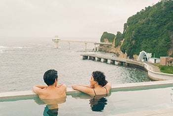 2022年7月にオープンした「edén」は、レストランとサーマルスプリングスパを併設した複合施設。スパエリアは水着で利用することができ、勝浦の海を一望しながら、インフィニティ温泉やサウナが楽しめる。レストランでは、地元で採れた食材を使ったパエリアをはじめとするシーフード料理も堪能できる。