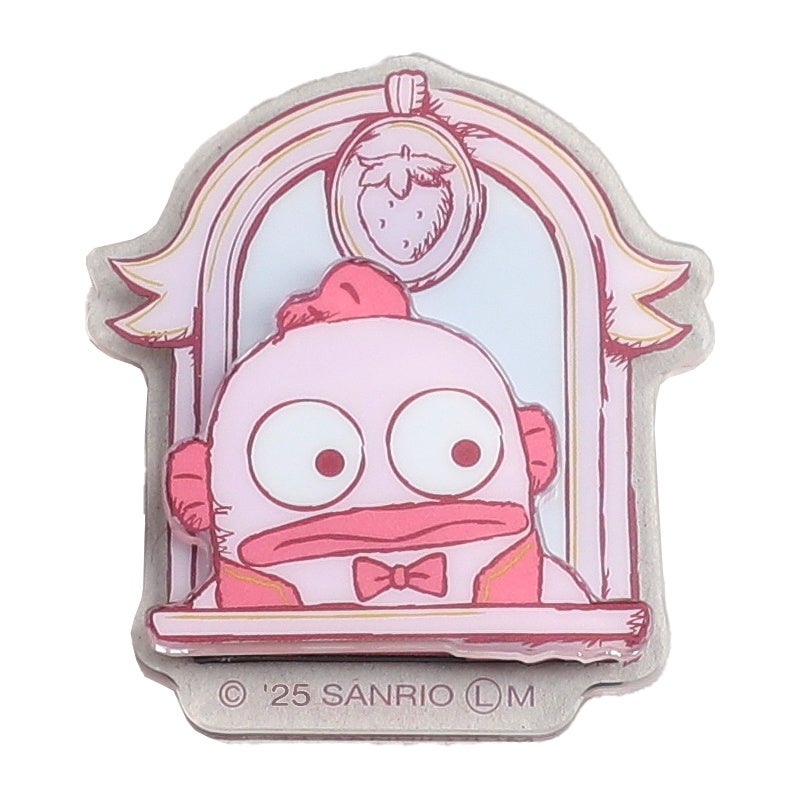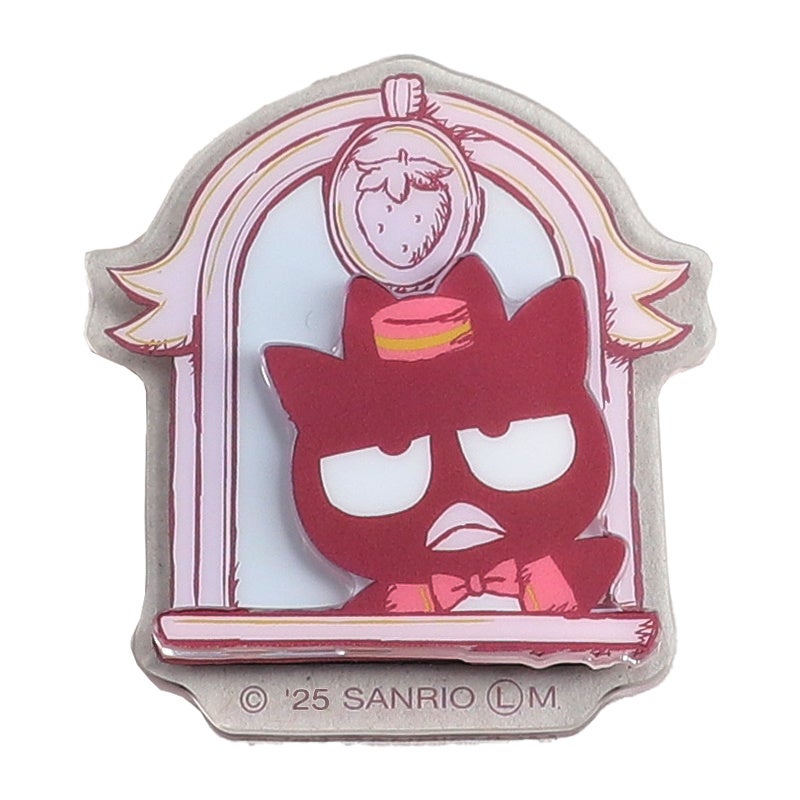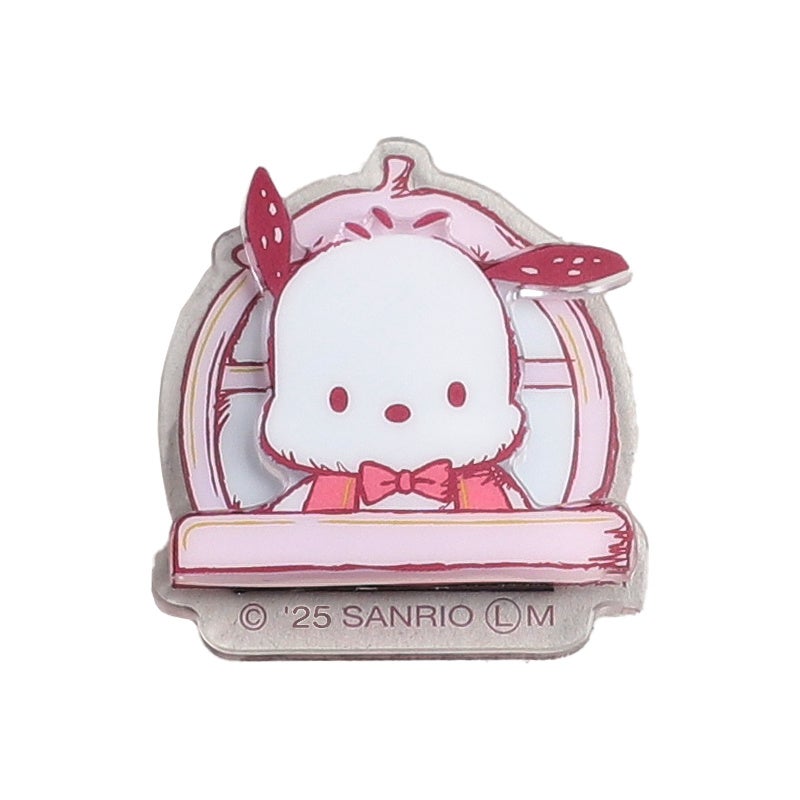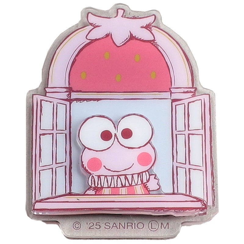 リボンや蝶ネクタイなどでおめかししたサンリオのキャラクターたちが、窓から顔を出してあいさつをしているデザインのアクリル製のマグネットです。アクリルはキャラクターと背景の窓部分の2層構造になっていて立体感があり、キャラクターが飛び出しているように見えるデザインです。並べて飾ると、キャラクターたちがメゾンの窓からあいさつしているように見えます。