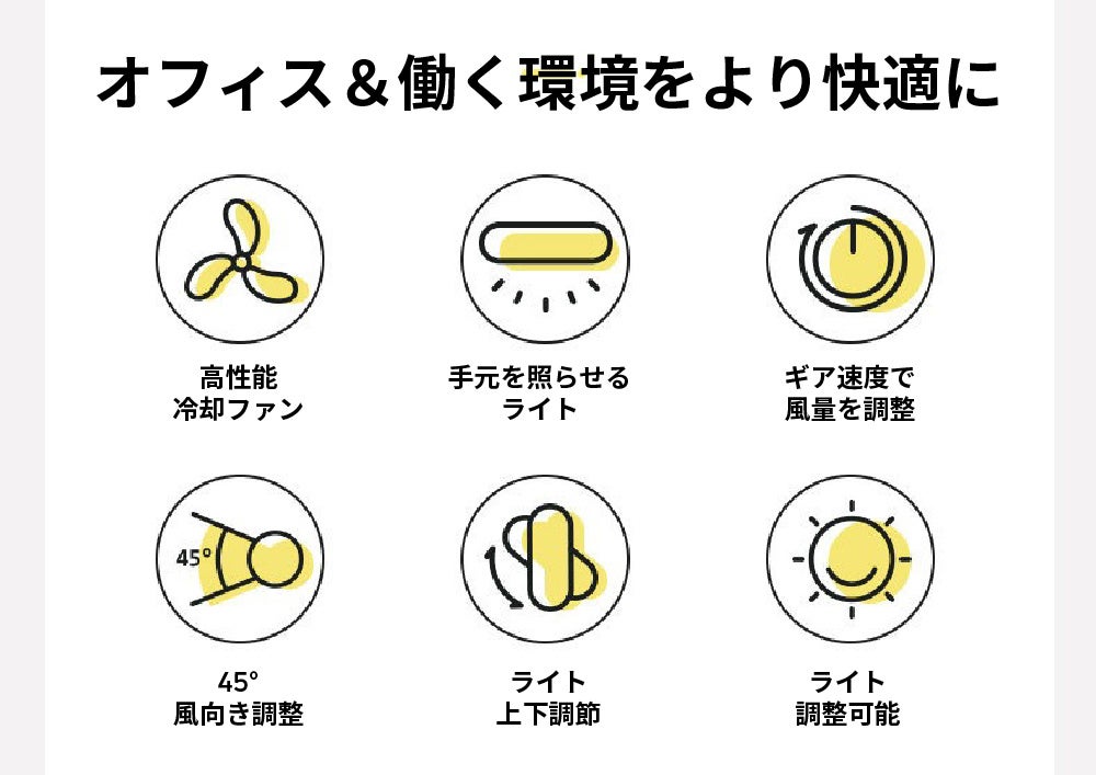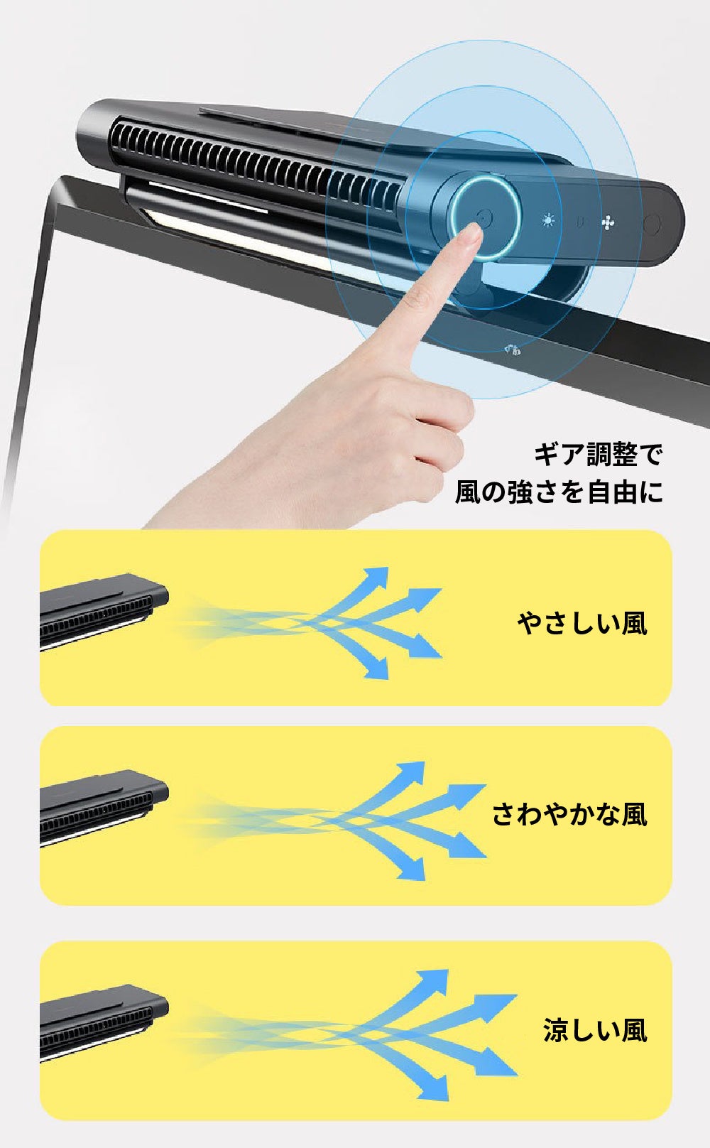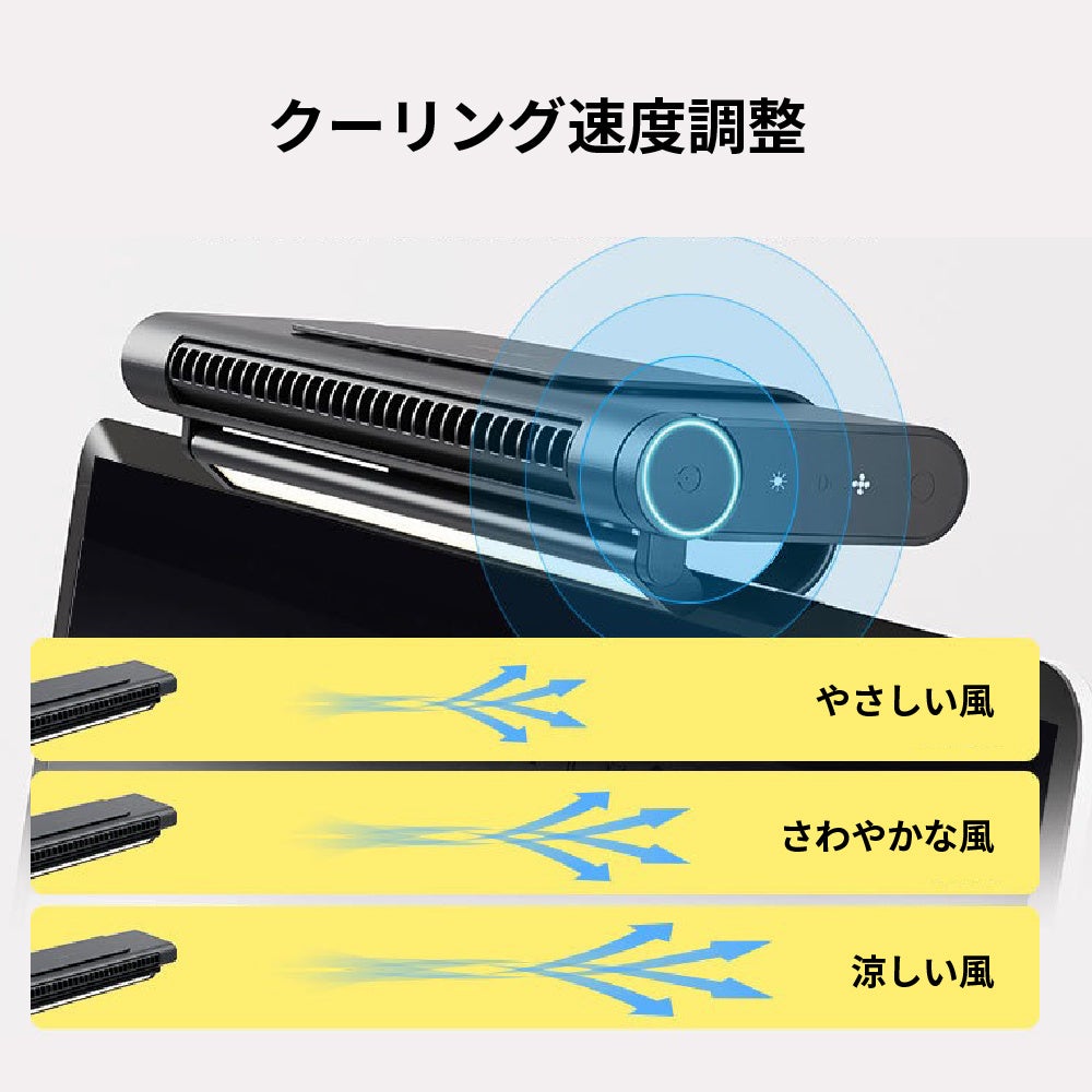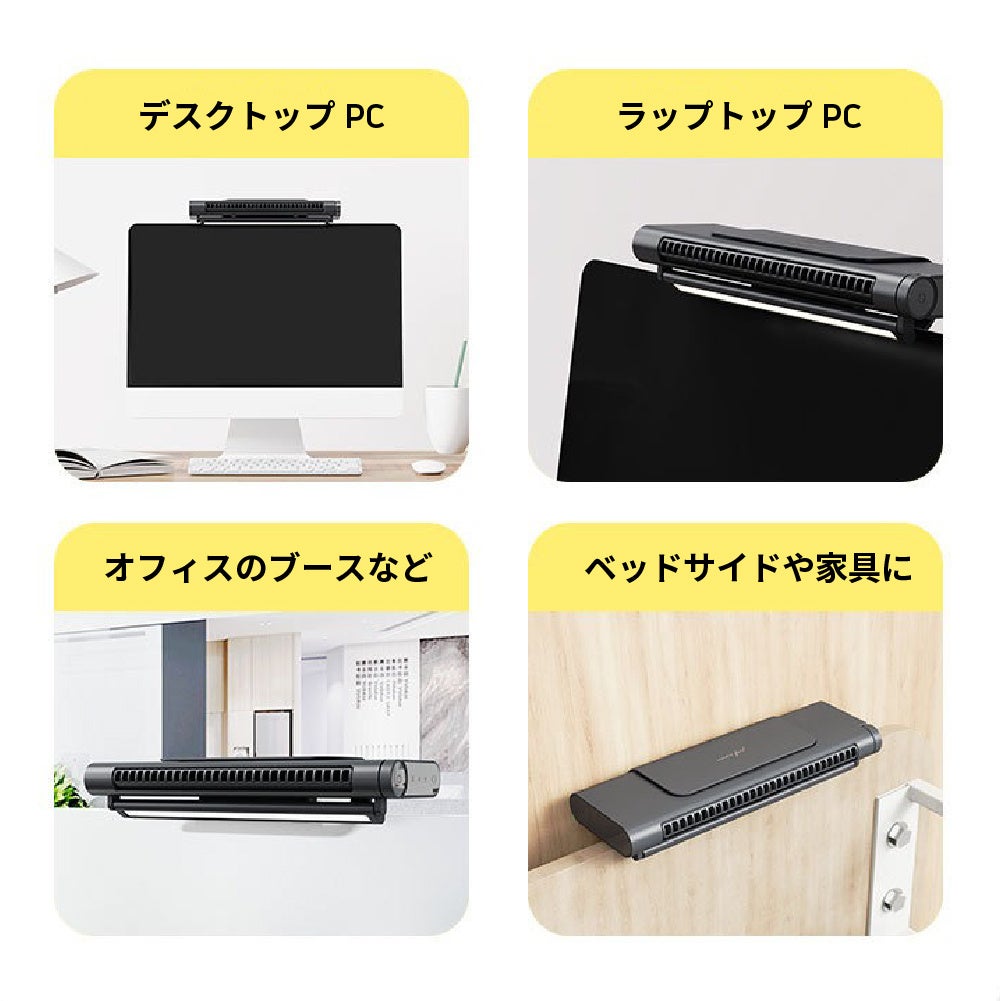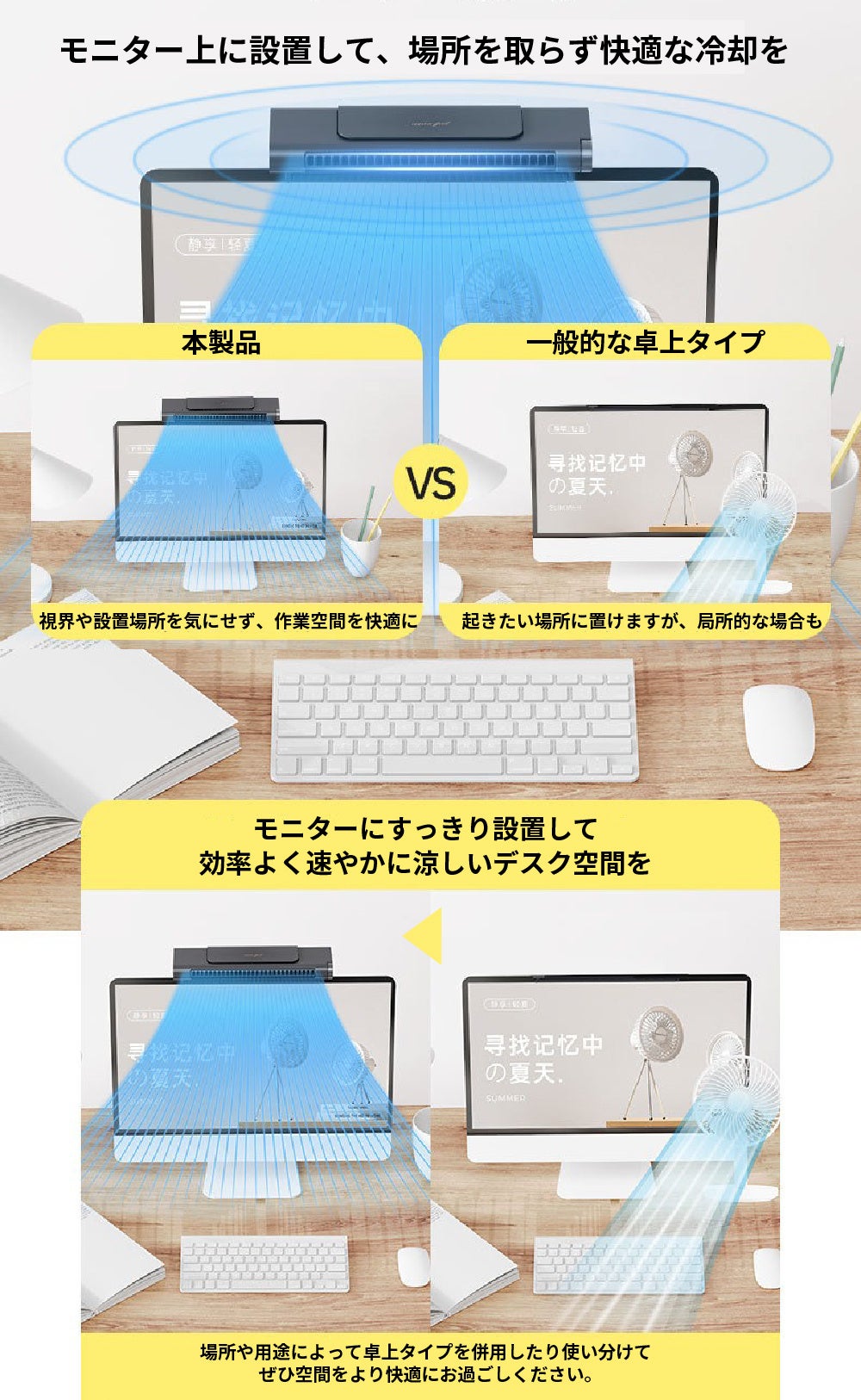 - モニター上から効率よくクーリング、卓上の場所を取らなくて快適な空間を作れる
