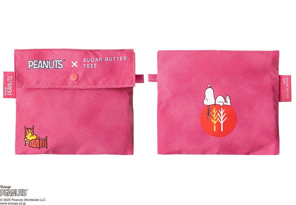スヌーピーとウッドストックを刺しゅうでデザインしたポーチと、ポップアップ付きボックスとのセットです。チャーム部分にさりげないシュガーバターの木ロゴをあしらい、細部までこだわり満載!ポーチとお菓子のセットは、贈り物にもおすすめです。