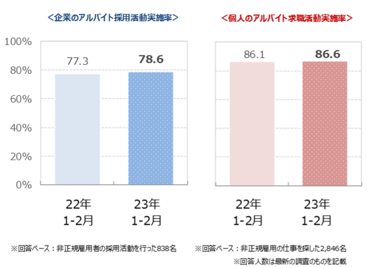 企業のアルバイト採用活動実施率は78.6%(22年1-2月比:1.3pt増)、また個人のアルバイト求職活動率は86.6%(22年1-2月比:0.5pt増)となり、ともに前年同時期比で増加した。【図1】