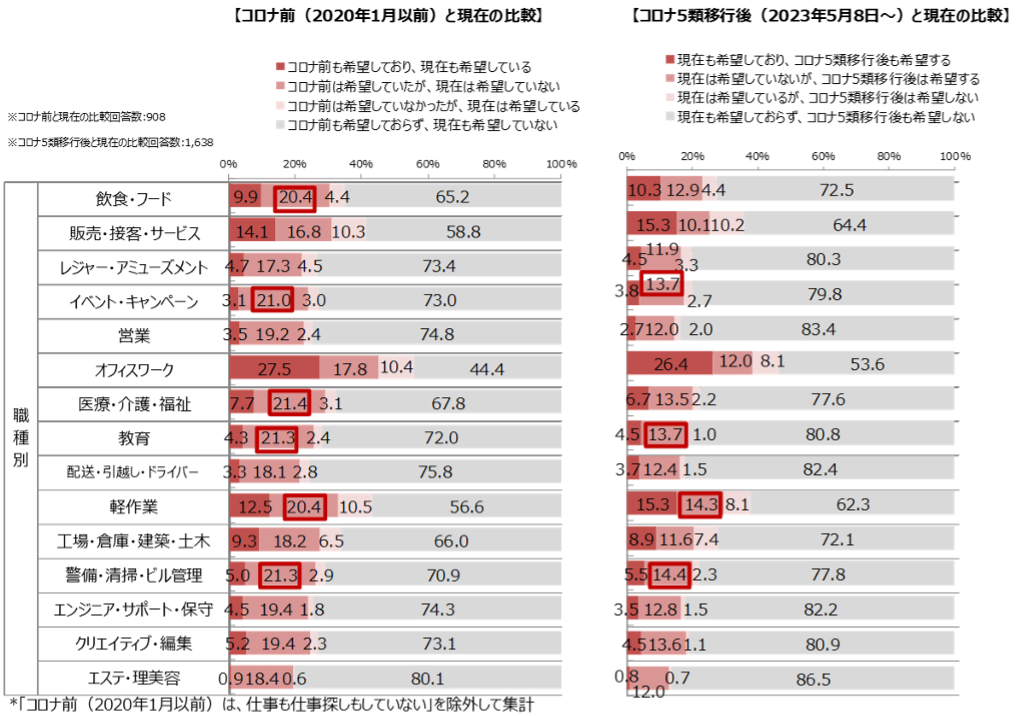 一方で、現在とコロナ5類移行後(2023年5月8日以降)で、希望職種に変化があるかを聞いたところ、「現在は希望していないが、コロナ5類移行後は希望する」職種は、[警備・清掃・ビル管理]が最も多く14.4%、次いで[軽作業]が14.3%、[イベント・キャンペーン][教育]で13.7%となり、コロナ禍によって求職意欲が減少していた職種が上位となった。規制緩和により、コロナ禍では避けられていた対面業務が多い職種においても、求職意欲が回復していくことが予想される。【図7】