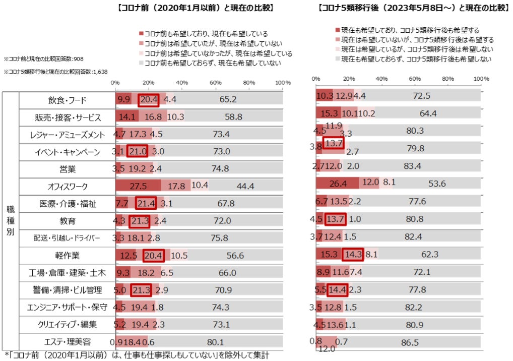 コロナ前(2020年1月以前)にも仕事・仕事探しをしていた人に、現在とコロナ前の希望職種に変化があったかを聞いたところ、「コロナ前は希望していたが、現在は希望していない」職種は[医療・介護・福祉]が最も多く21.4%、次いで[教育][警備・清掃・ビル管理]が21.3%となり、その他[イベント・キャンペーン][飲食・フード][軽作業]も2割を超えた。