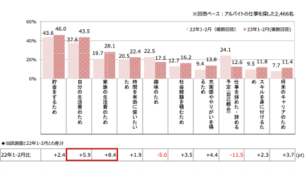 個人がアルバイトの求職活動をする理由は、「貯金をするため」が46.0%(22年1-2月比:+2.4pt)で最も多く、次いで「自分の生活費のため」が43.5%(22年1-2月比:+5.9pt)、「家族の生活費のため」が28.1%(22年1-2月比:+8.4pt)となり、生活費に関する回答が前年同時期比で大きく増加した。物価高の影響を受けて、生活費を補填する目的でアルバイトを探す人が増加したとみられる。【図2】