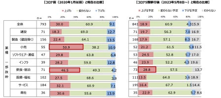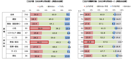 コロナ5類移行後に非正規社員数を増やす予定の企業は31.0%で、業種別では[飲食・宿泊]が最も多く54.7%となった。また、飲食・宿泊業では、コロナ前(2020年1月以前)より非正規社員の時給を上げた企業が46.5%と小売業(50.9%)に次いで高く、コロナ5類移行後に時給を上げる予定の企業も28.8%と業種別で最多なった。給与改定に取り組む企業の様子がうかがえ、人手確保の競争はさらに加速しそうだ。【図5、6】