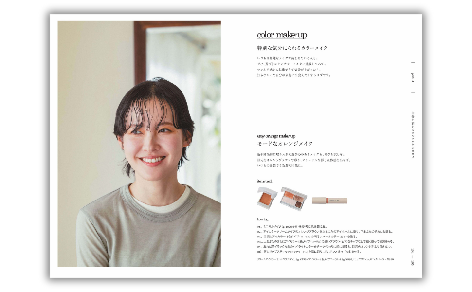 スキンケアで大切なのは、"いいものを惜しみなく使う”ことと" 正しいスキンケアをする”こと。そうすれば自分史上最高の肌を作ることができます。本書では、無印のスキンケアシリーズを使ったヘアケア、スキンケア、ボディケアの方法を詳しく紹介。毎日の生活を彩るミニマルメイクも必見です。