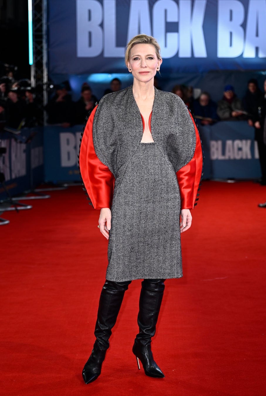 ケイト·ブランシェットは、2023年秋冬コレクションより既存の生地で再構築したルック34のグレーとレッドのバイマテリアルウールドレスを着用しました。