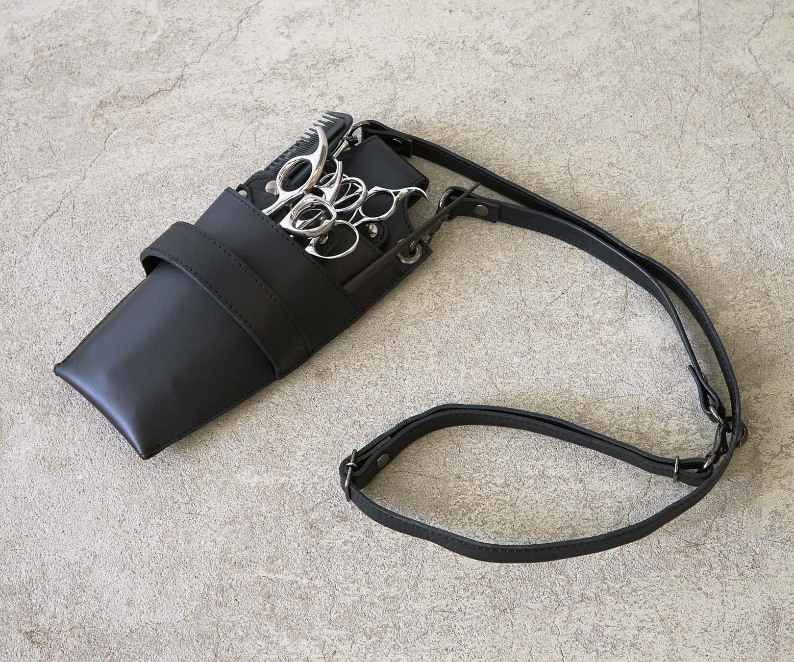 シャープなフォルムとミニマムなデザインで、HAREのモードなスタイルとの相性の良さを追求したレザーエプロンとシザーケースです。