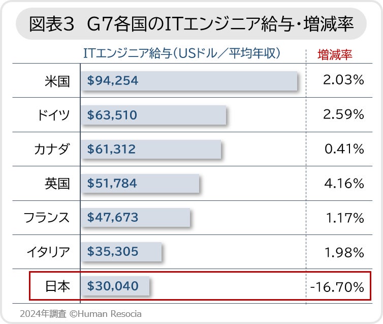 ●日本はITエンジニア給与で31位、前年比の増減率では59位で、いずれもG7構成国で最下位となり、グローバルなITエンジニア獲得競争で後れをとることが懸念される