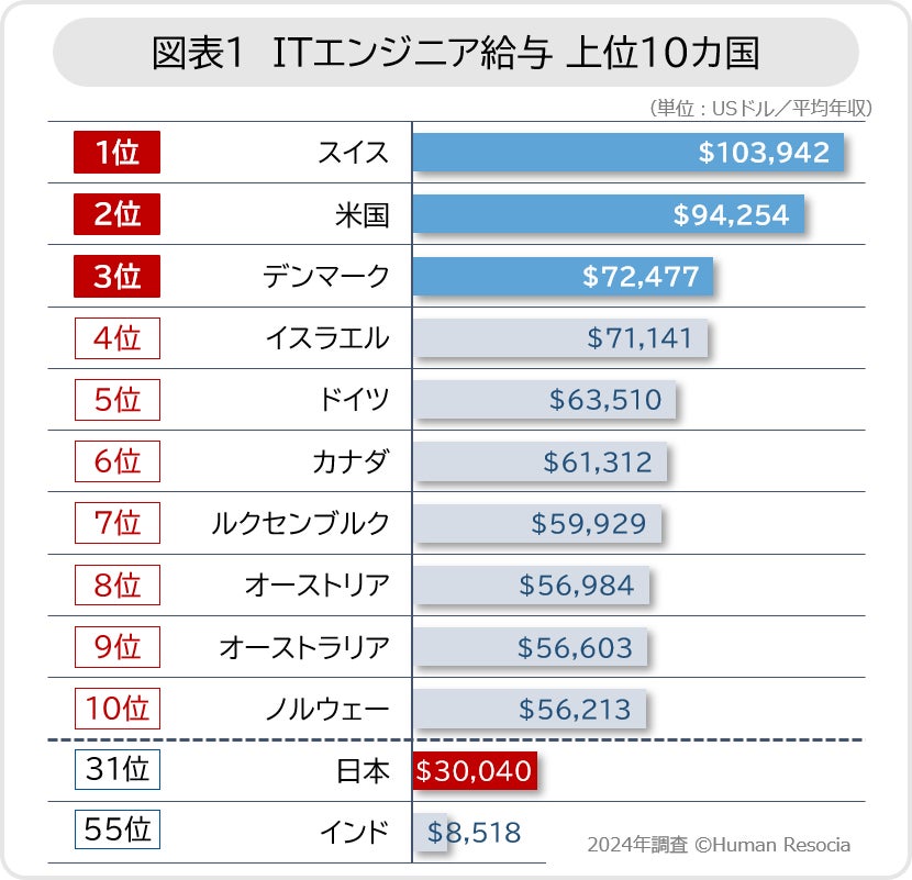 ●世界73カ国のITエンジニアの給与、USドルベースでは1位スイス、2位米国、3位デンマーク