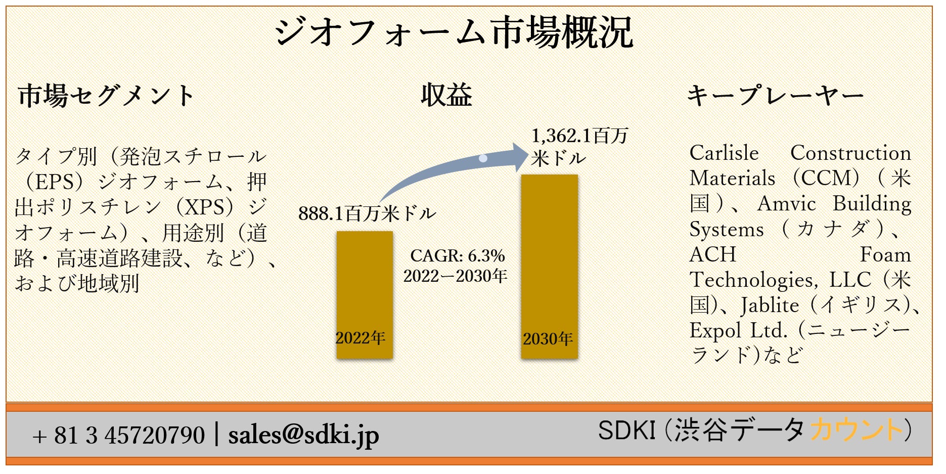 ジオフォーム市場は、2022年に888.1百万米ドルの市場価値から、2030年までに1,362.1百万米ドルに達すると推定され、2022-2030年の予測期間中に6.3%のCAGRで成長すると予想されています。