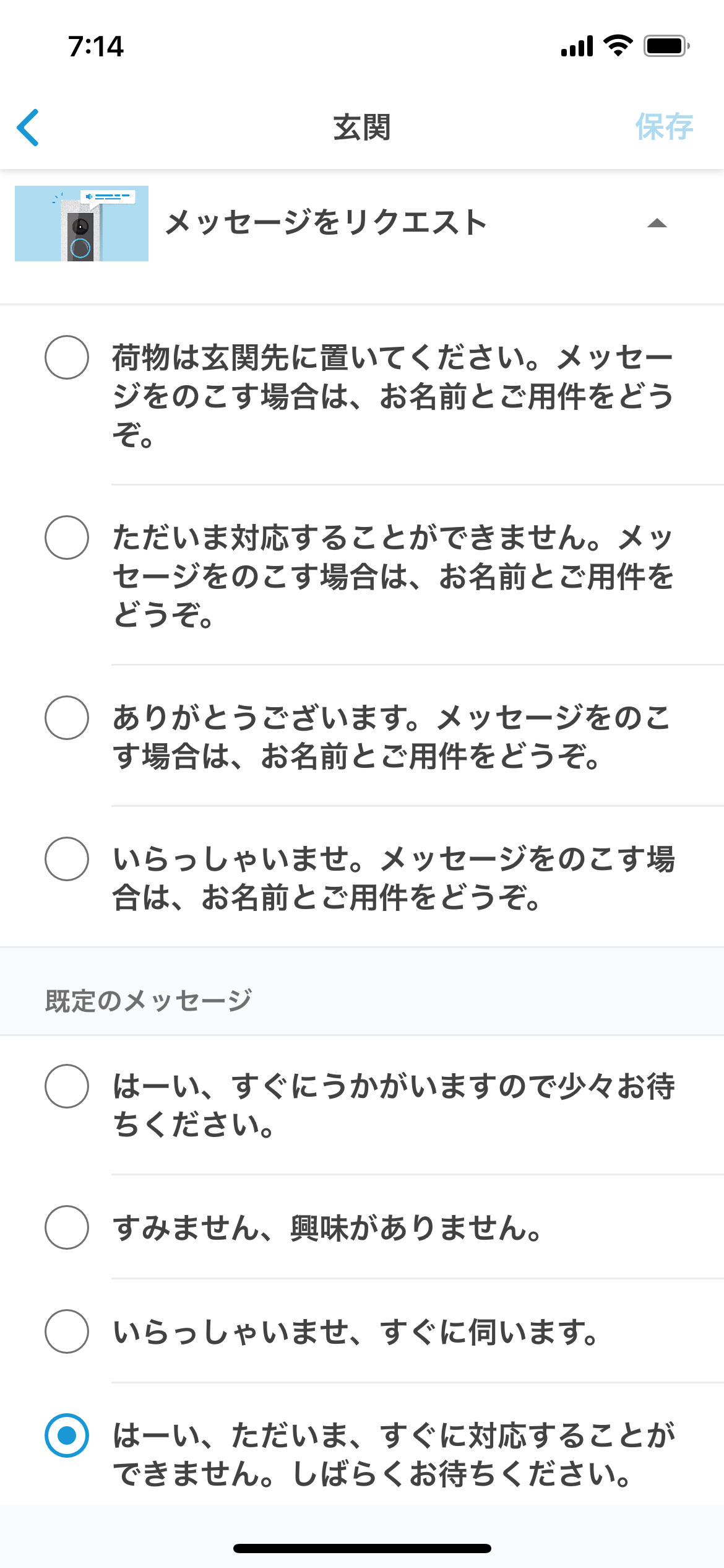Amazonは本日11月7日(火)、ホームセキュリティカメラ※1を展開するRing(リング)のドアベルシリーズに対応する新機能「クイック応答」を日本でも追加することを発表しました。これは、お客様が8つの定型メッセージから事前に選択した返答を、来客者がドアベルを押した際に自動的に発話させる新機能です。ドアベルを押してから即時、2秒、5秒、10秒、15秒、20秒後のいずれかのタイミングで返答を事前設定できるほか、来客のライブ映像を確認しながら発話メッセージを選択することも可能です。外出時だけでなく、在宅時でも家事やリモートワークで手が離せない場合などにご活用いただけます。