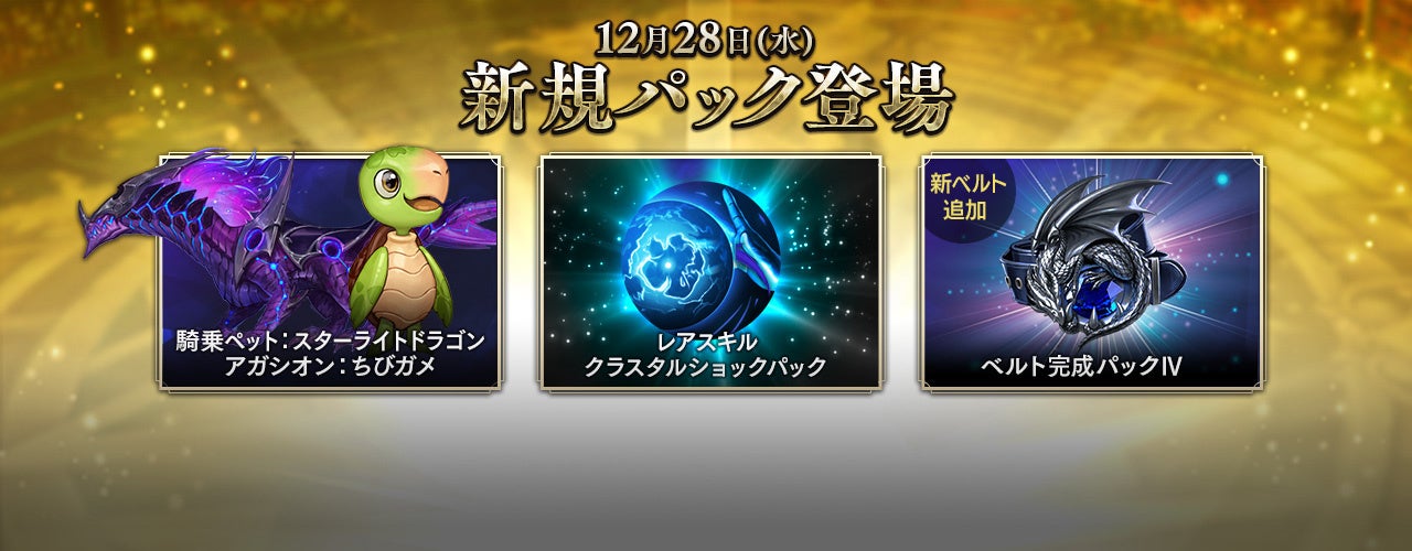本アップデートより、新騎乗ペット「スターライトドラゴン」と新アガシオン「ちびガメ」が登場いたします。登場を記念して、「[スターライトドラゴン登場記念]スターライトドラゴンLR進化パック」や「ちびガメLR進化パック」などを追加しております。