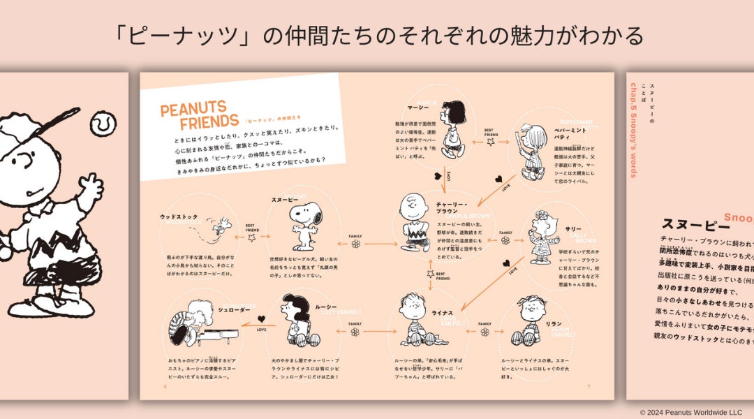 良くも悪くも考えすぎるタイプのチャーリー・ブラウン、わがままだけど自分の気持ちに正直なルーシー、どんなにひどい成績でも自分を見失わないペパーミント パティ、勉強ができるけど実は両親の愛にうえているマーシー、「安心毛布」が手放せないけれど哲学的な名言が多いライナス、当たり前のことでも「なぜ?」が止まらない学校ぎらいなサリー、そして、ありのままの自分が好きで、日々のしあわせを見つけるのが得意なスヌーピー。ほかにも、おもちゃのピアノに没頭するシュローダーや、自分がなんの小鳥かも知らないウッドストックなど、お馴染みの仲間たちが登場します。