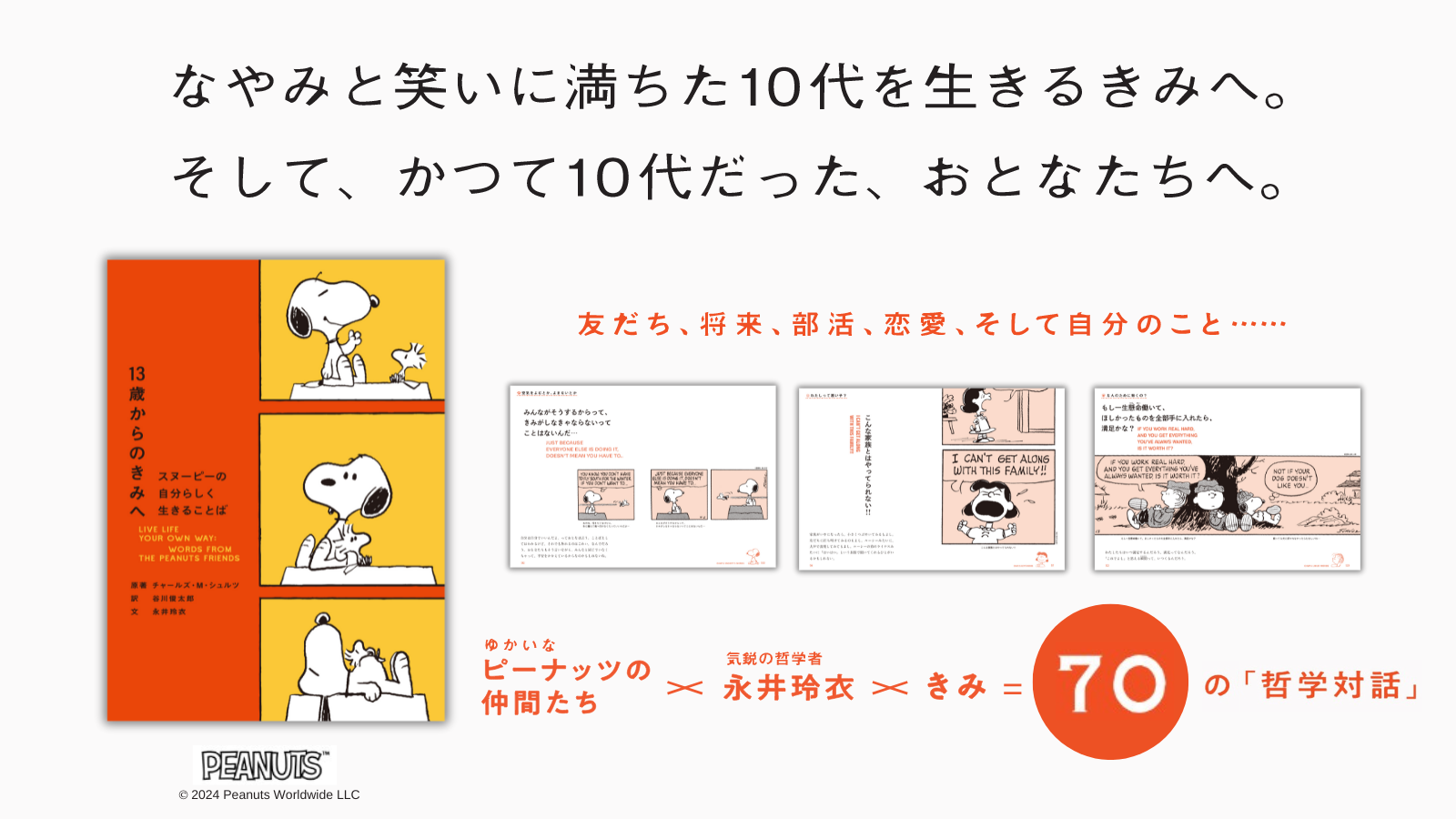 チャールズ・M・シュルツが描き、谷川俊太郎が見事な翻訳を手掛けた「ピーナッツ」の世界と、多感な10代の心を持つ読者を繋ぐのは、いま注目の哲学者・永井玲衣。10代を決して子ども扱いせず、対等な立場から誠実に寄り添う文が真っ直ぐ心に届きます。
