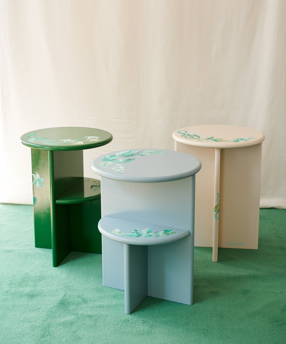 ハンドペイント、プリント、刺繍、タフティングなど様々なテクニックでTOLIGHTのデザインをプロダクトに落とし込み素材ごとに見え方や質感も違うのでその違いを楽しんでいただけたらと思います。