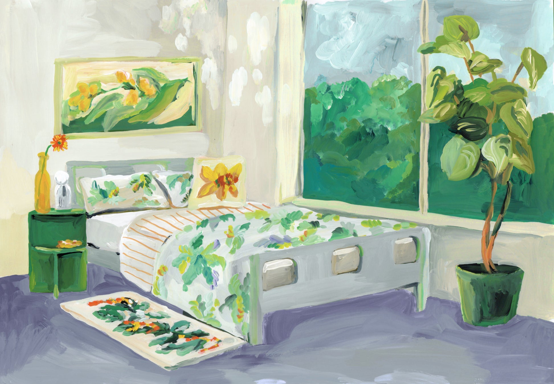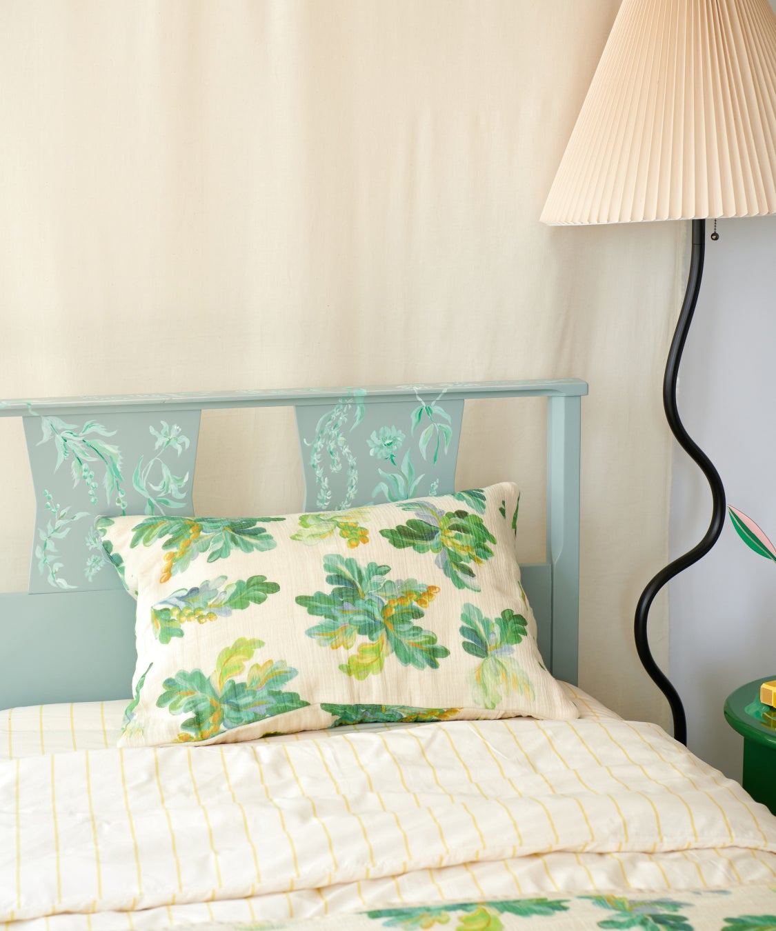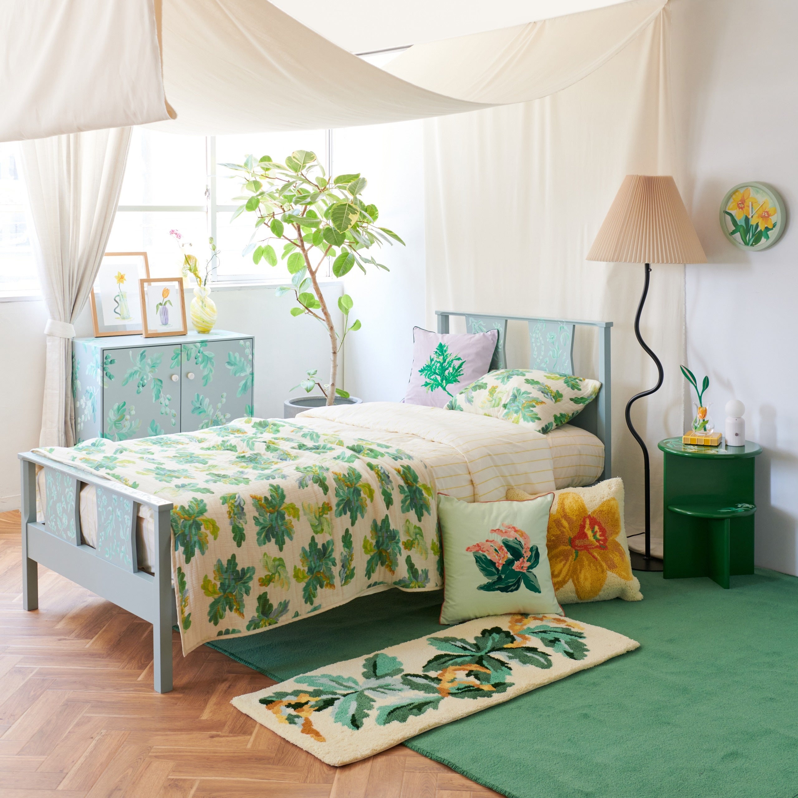 シンプルになりがちなベッドルームに彩りを与えてくれるスローケットやクッションカバーのファブリックアイテムを中心に、ハンドドローイングで鮮やかに花を描いた一点物の家具も新たに登場します。