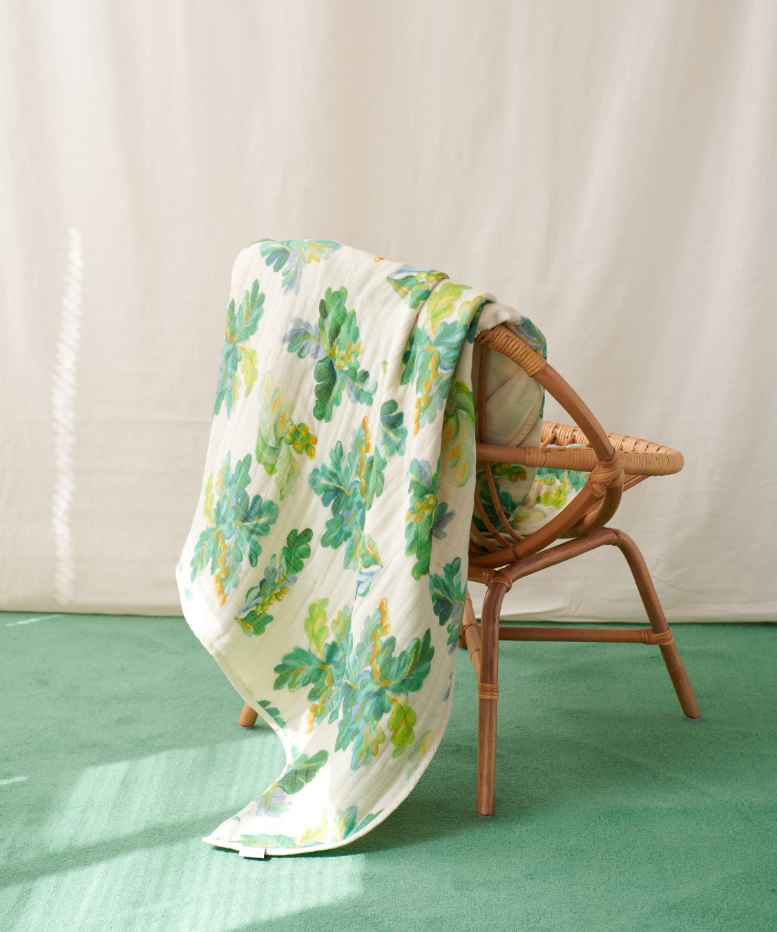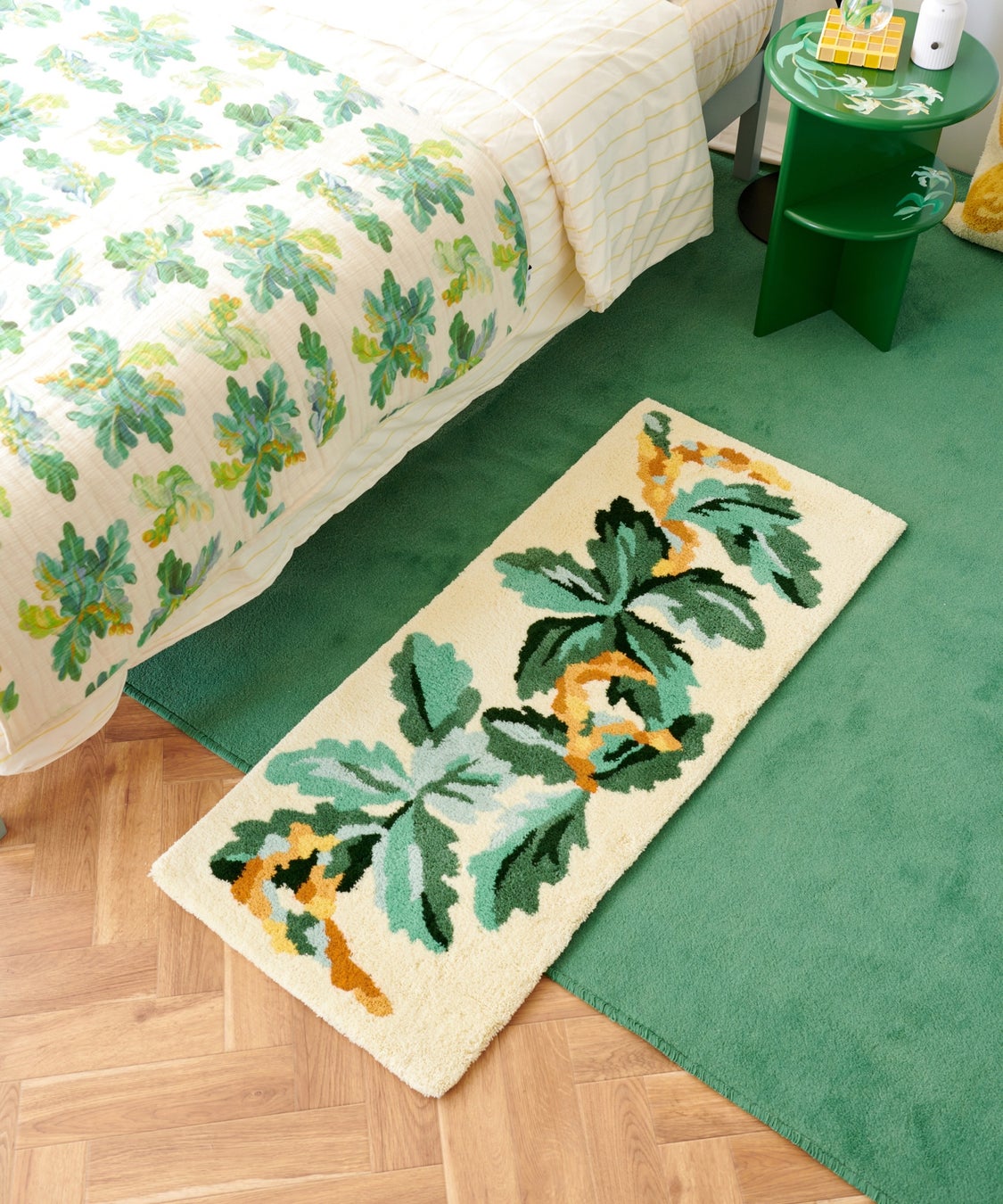 ベッドスロー、ピローカバー、ラグに使用しているリーフ柄は朝露を反射して、朝日を写し、さまざまな色に 輝く生命の美しさを描いています。
