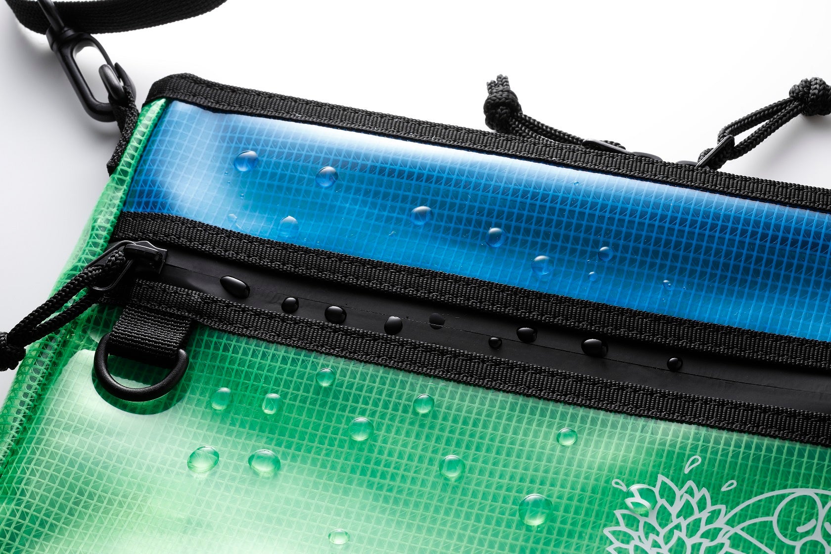 ボディーは色つきの透明ビニールとメッシュビニールを重ねて、開口部に止水ファスナーを採用。どちらも撥水性と防汚性に優れた素材なので、濡れたタオルなどで軽くこするだけでシミや汚れを簡単に拭き取ることができます。