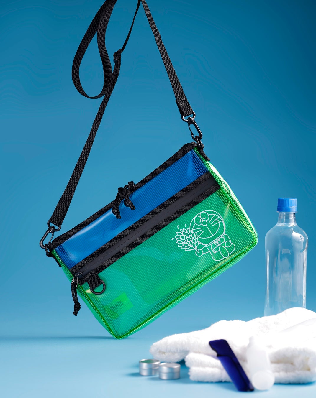 ヴィヒタを片手に瞑想する『ドラえもん』を大胆にプリントした、プレミアムなデザインのサコッシュです。驚くべきは、その収納力。マチ幅2.5cmのボディーに、シャンプーのミニボトルやスキンケアグッズ、そしてなんと500mlのペットボトルまで、温浴施設で必要な道具一式を収納可能。さらにスマートフォンや財布といった濡らしたくない小物は前部のポケットに仕分けられるのも便利です。