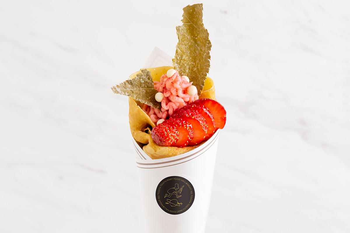 焼き立てもちもち食感のクレープ生地に、ほどよい甘みのマスカルポーネチーズのクリームを合わせ、ラズベリー、桜の花とくるみのクランチ、神戸産いちごをトッピング。トップにクリームチーズを合わせたいちご餡を重ね、仕上げに桜の葉っぱのチュイルを飾った春に美味しい桜のクレープです。